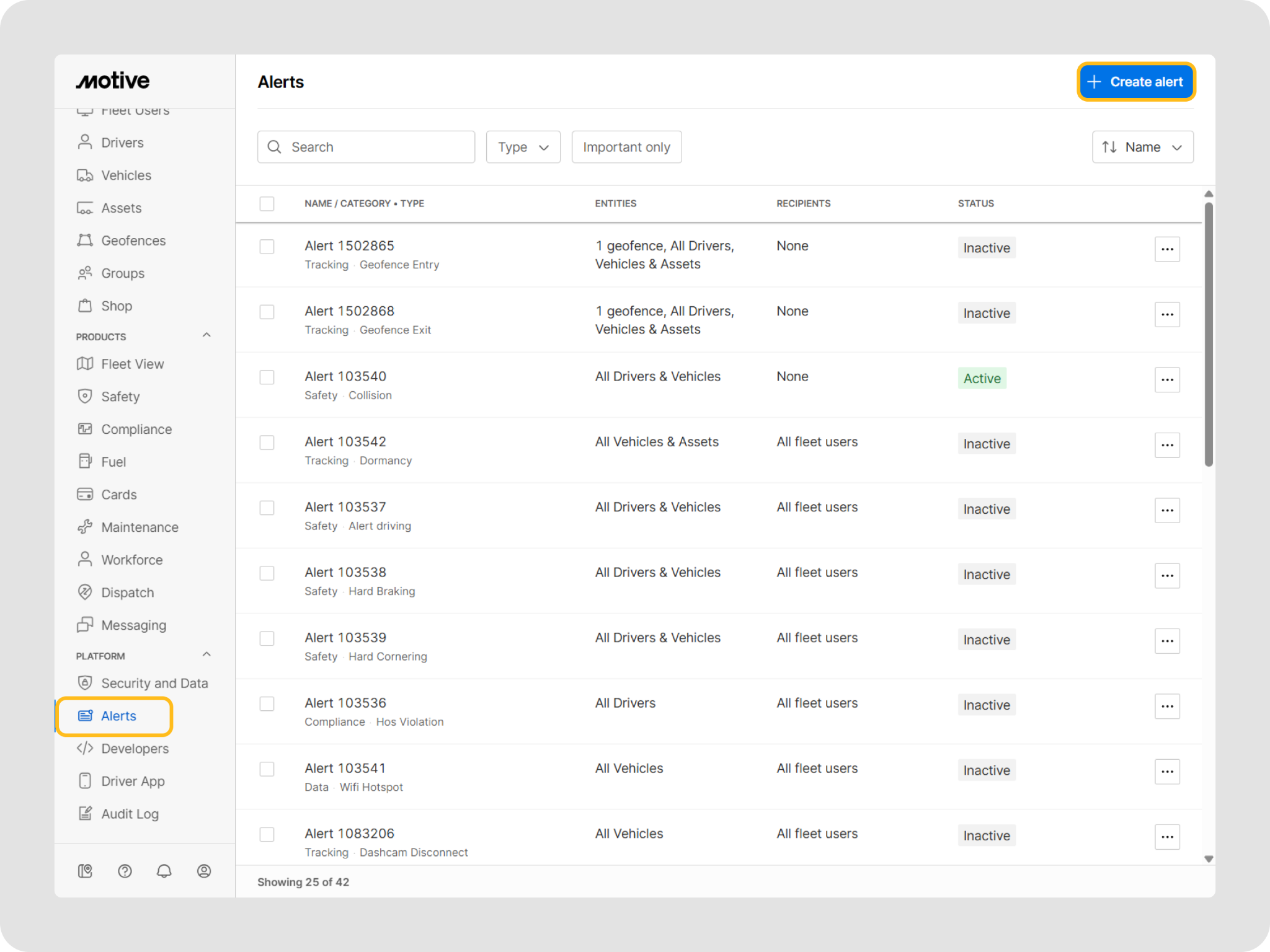 Comprender y responder rápidamente a los problemas de inspección y mantenimiento es fundamental para la seguridad y eficiencia de la flota. Las funciones de análisis y notificación de Motive facilitan la supervisión de la salud de la flota, el seguimiento del cumplimiento y la acción inmediata ante necesidades urgentes de mantenimiento.