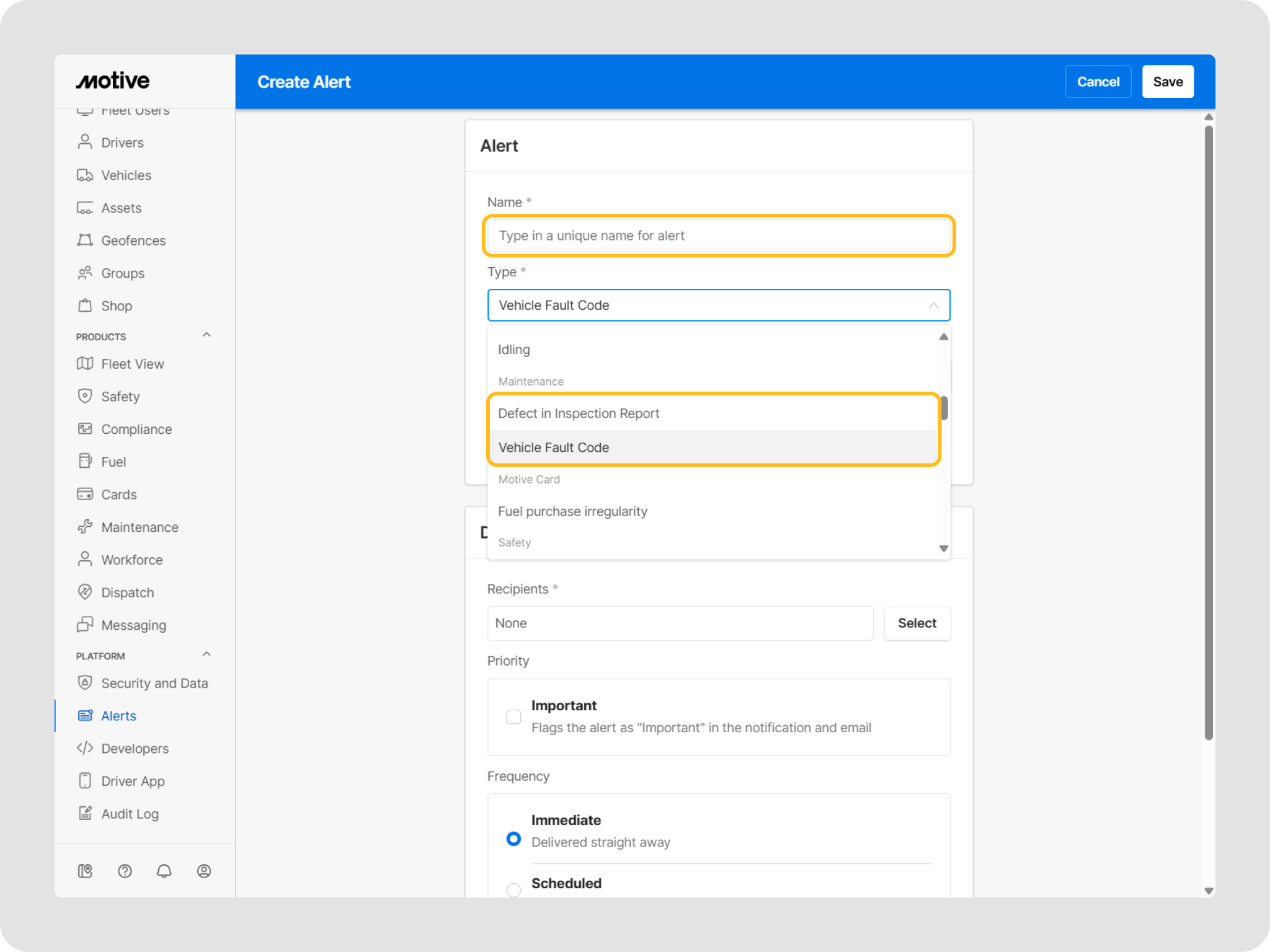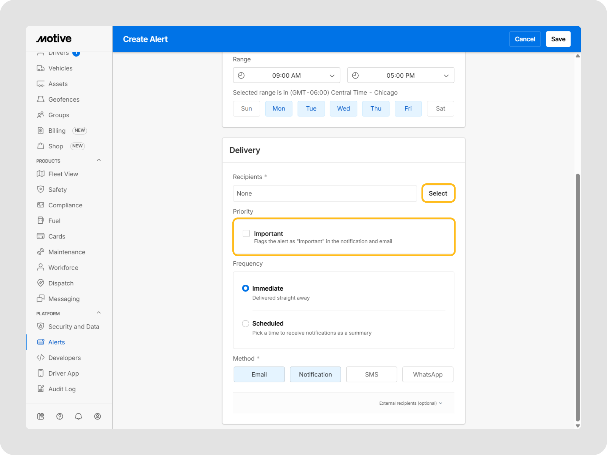 - En Destinatarios, haga clic en Seleccionar para elegir qué usuarios de la flota, conductores o grupos recibirán esta alerta.