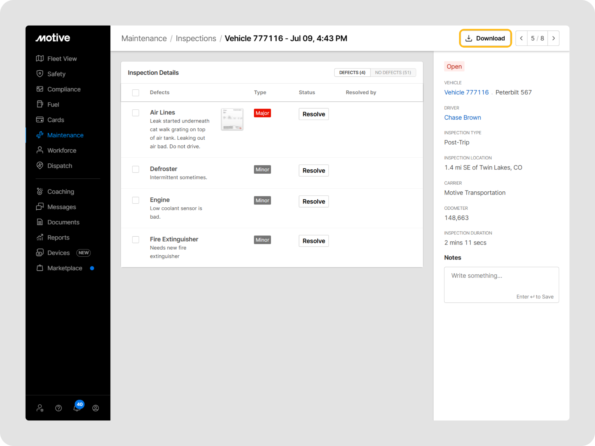 Inicie sesión en el Motive Fleet Dashboard, vaya a Mantenimiento, abra la pestaña Inspecciones, seleccione una inspección y vea los detalles bajo Detalles de inspección. Puede hacer clic en Descargar para exportar el informe de inspección en PDF.