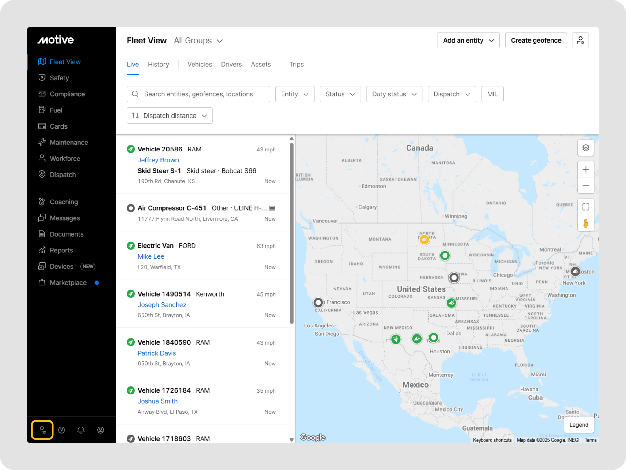 - Inicie sesión en el Motive Fleet Dashboard y haga clic en el icono de Admin.