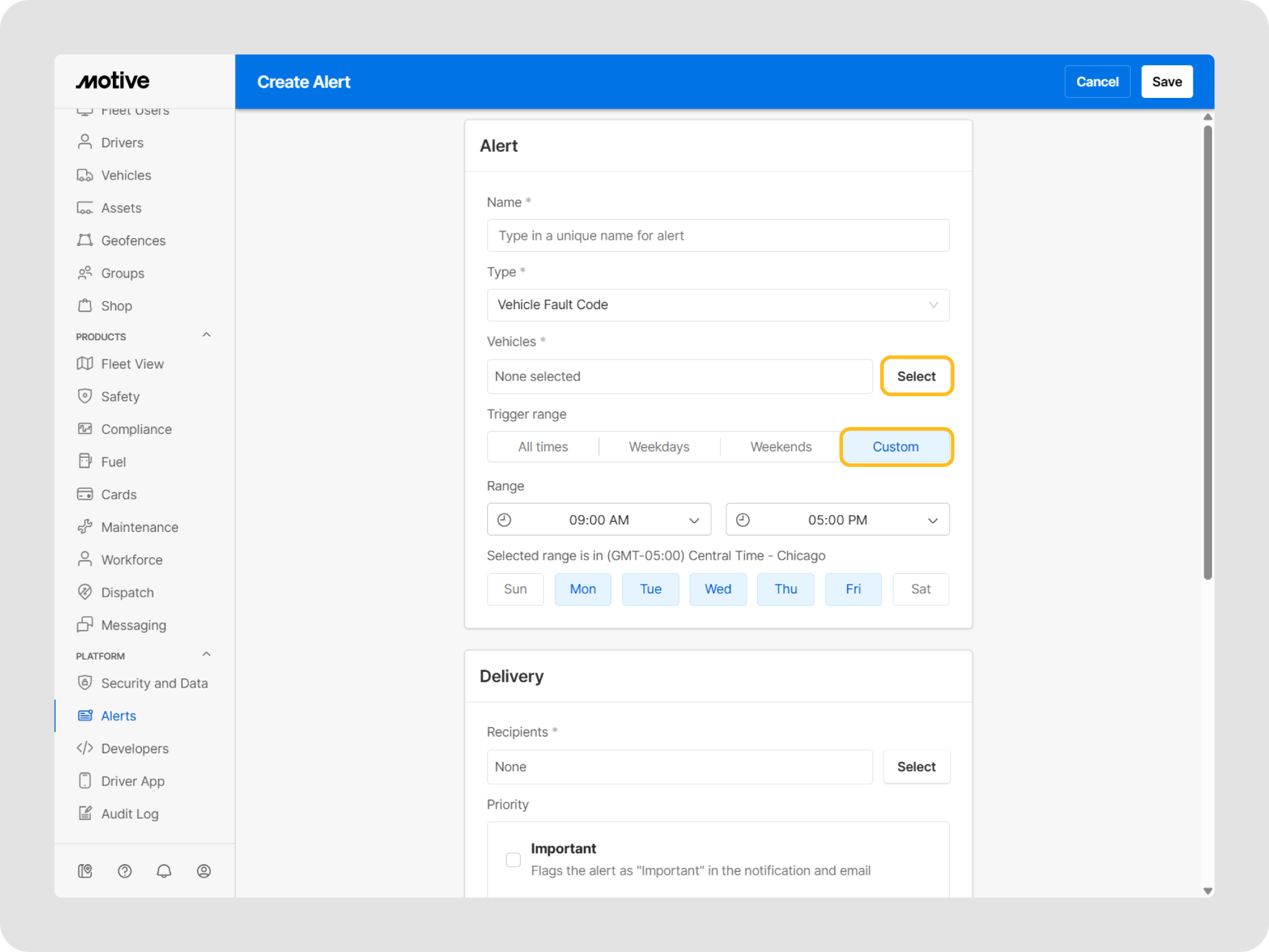 - En Vehículos, haga clic en Seleccionar para asignar esta alerta a vehículos.