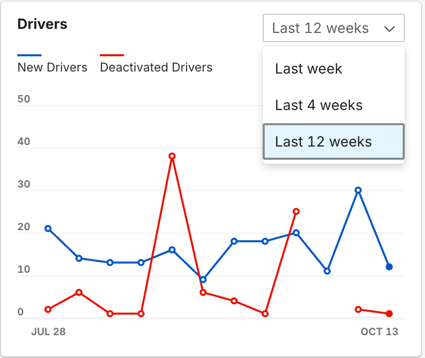 El widget Conductores muestra la tendencia de conductores nuevos y desactivados dentro de la flota según el período seleccionado por el usuario de la flota (como Última semana, Últimas 4 semanas, Últimas 12 semanas).