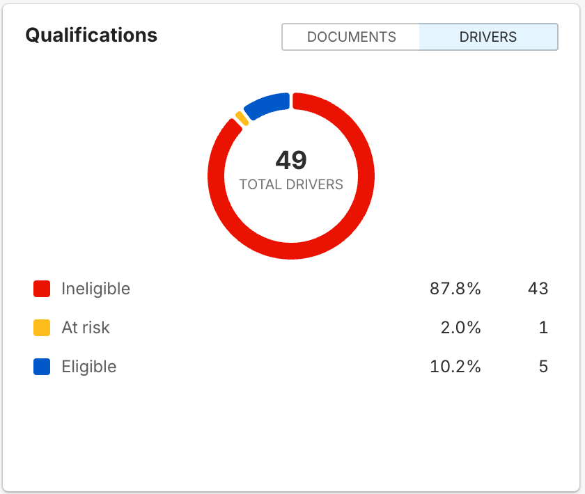 - Elegible: Estado de calificación del conductor cuando todos los documentos están fuera de la ventana de 30 días antes de su vencimiento. Este es también el estado predeterminado para cualquier conductor sin documentos asociados.