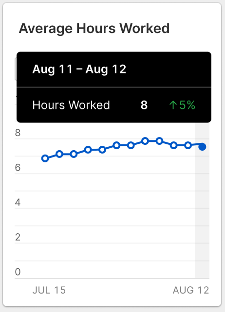 - Pase el cursor sobre los elementos del gráfico para ver valores precisos del promedio de horas trabajadas y la tendencia para la fecha o rango elegido.