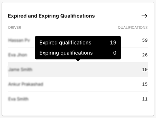 - Haga clic en la flecha en la parte superior derecha del widget para navegar a la pestaña Fuerza Laboral > Calificaciones, prefiltrada para ver todos los conductores con calificaciones vencidas o por vencer.