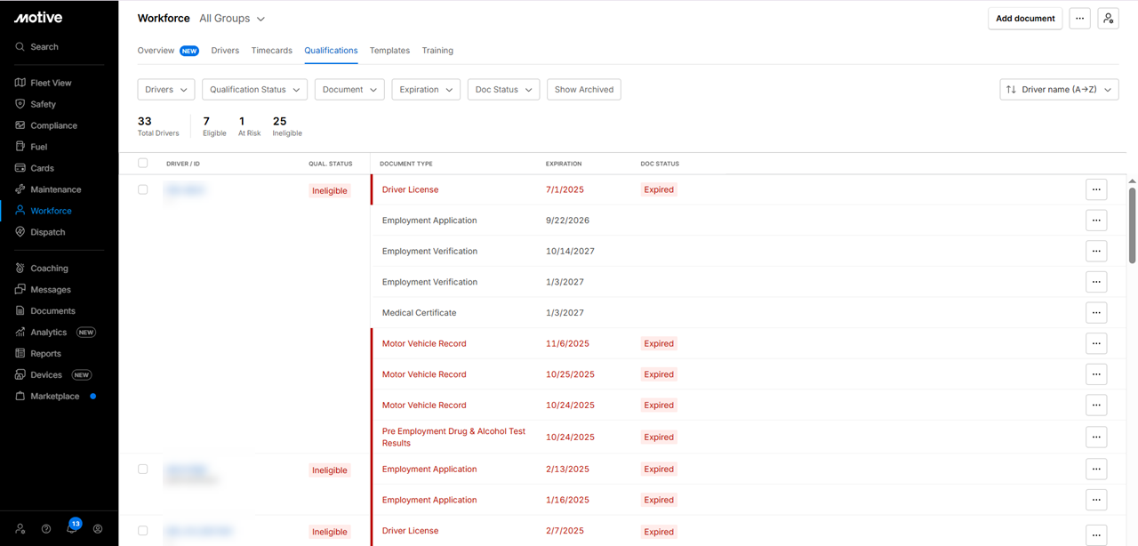 Esta pestaña le ayuda a rastrear y gestionar documentos de calificación de conductores sin problemas con estado en tiempo real y filtrado por estado del conductor, tipo y estado del documento, vencimiento y otros filtros.