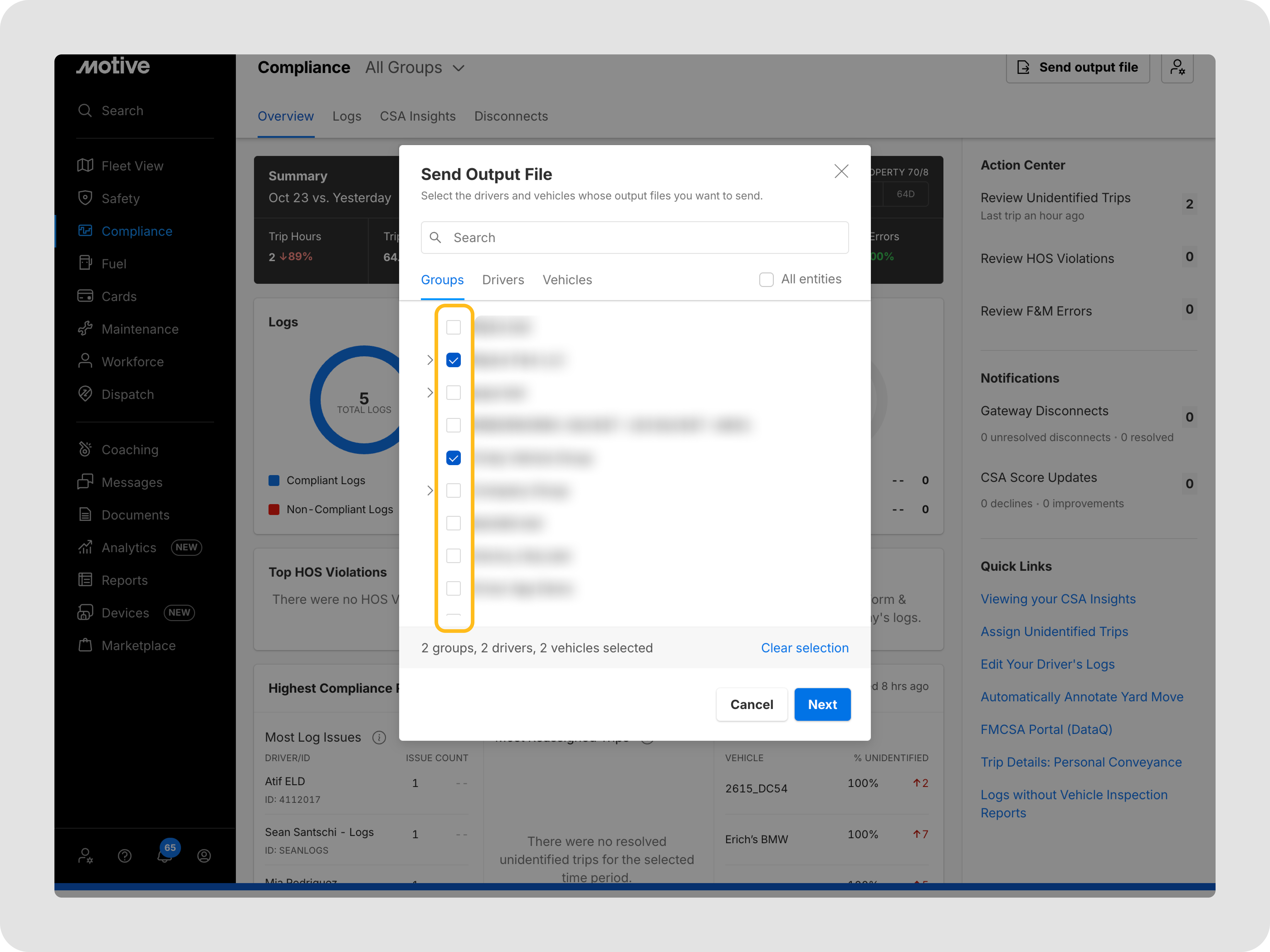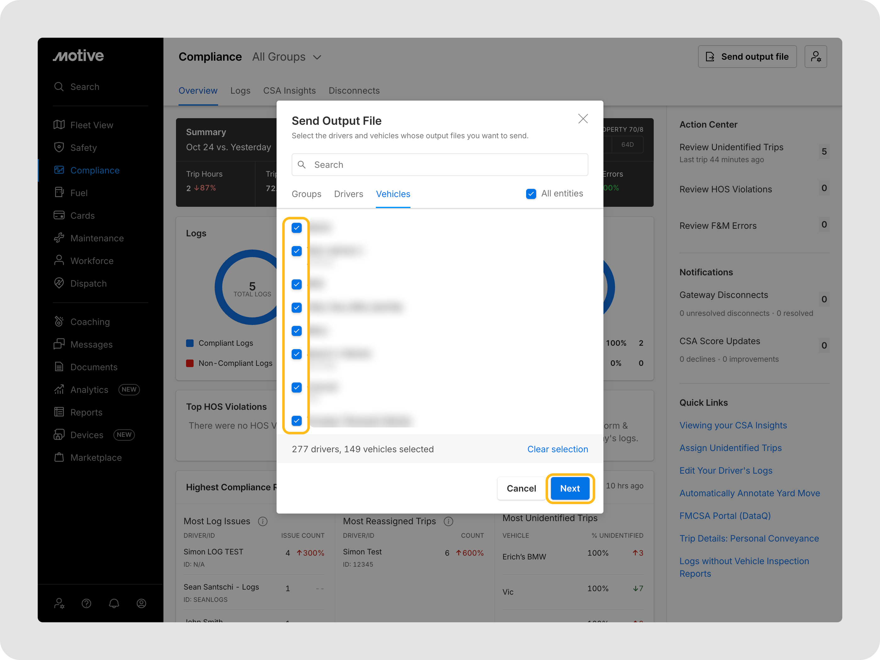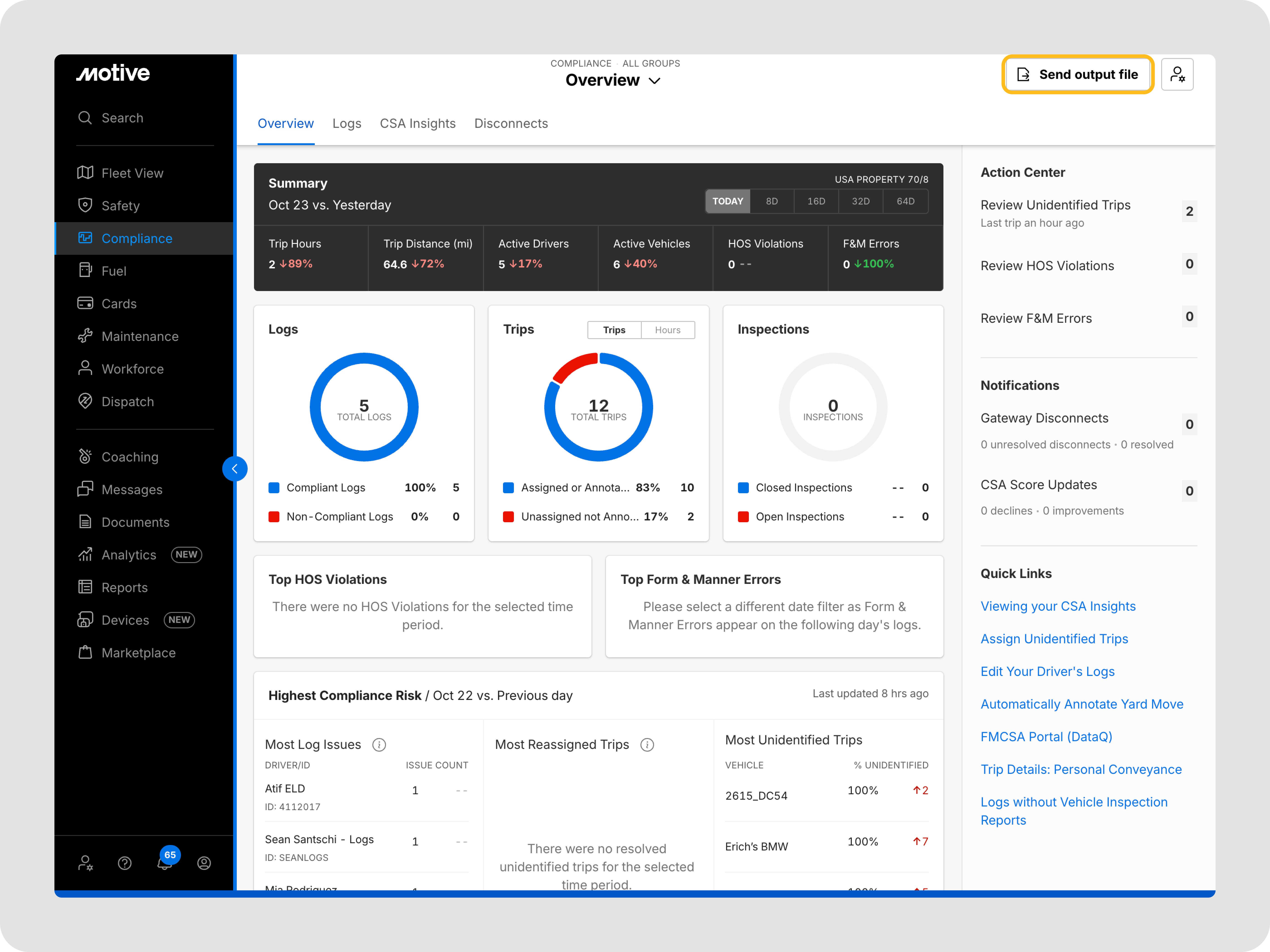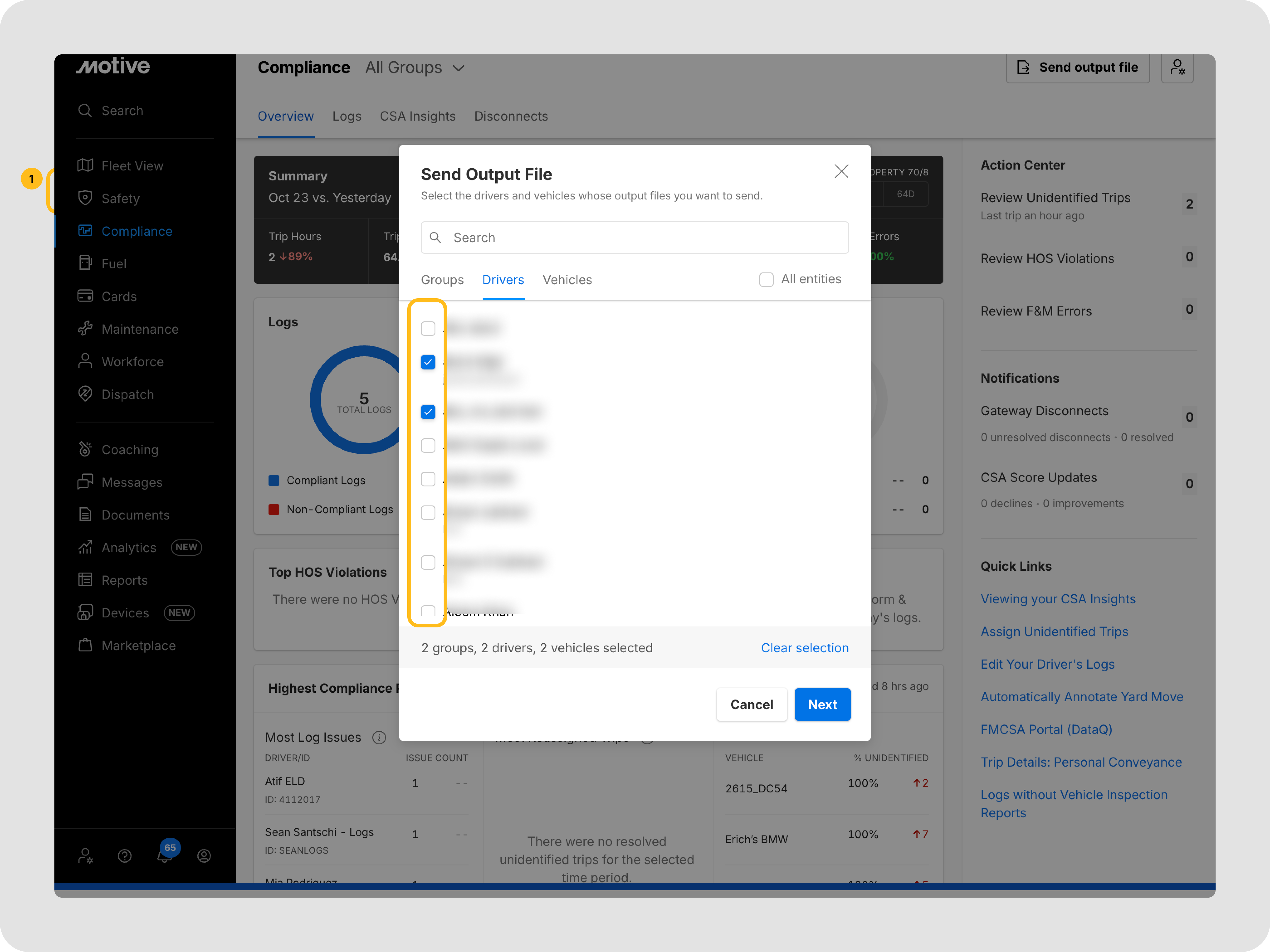 - Inicie sesión en el Panel de Flota y vaya a Cumplimiento.