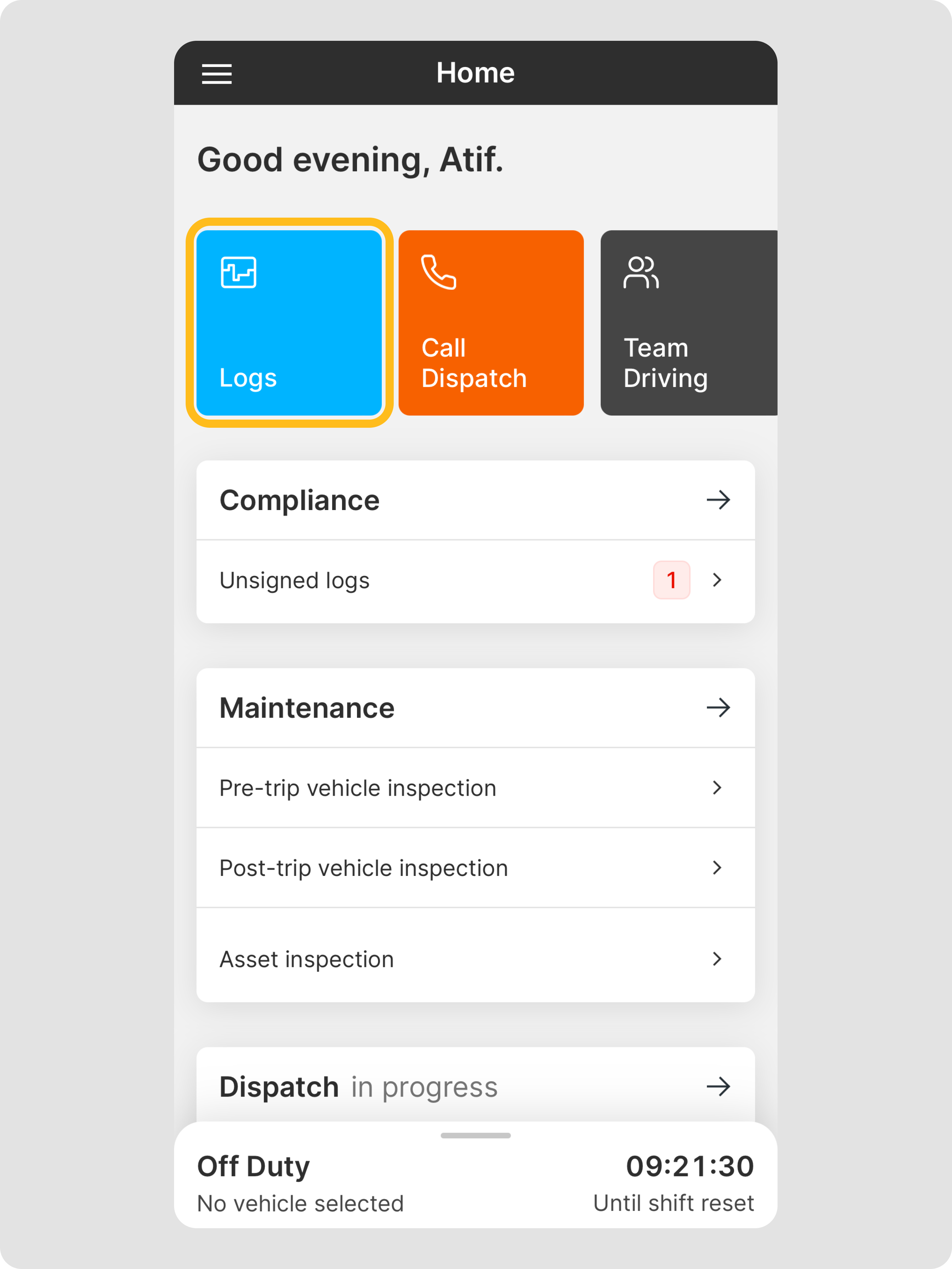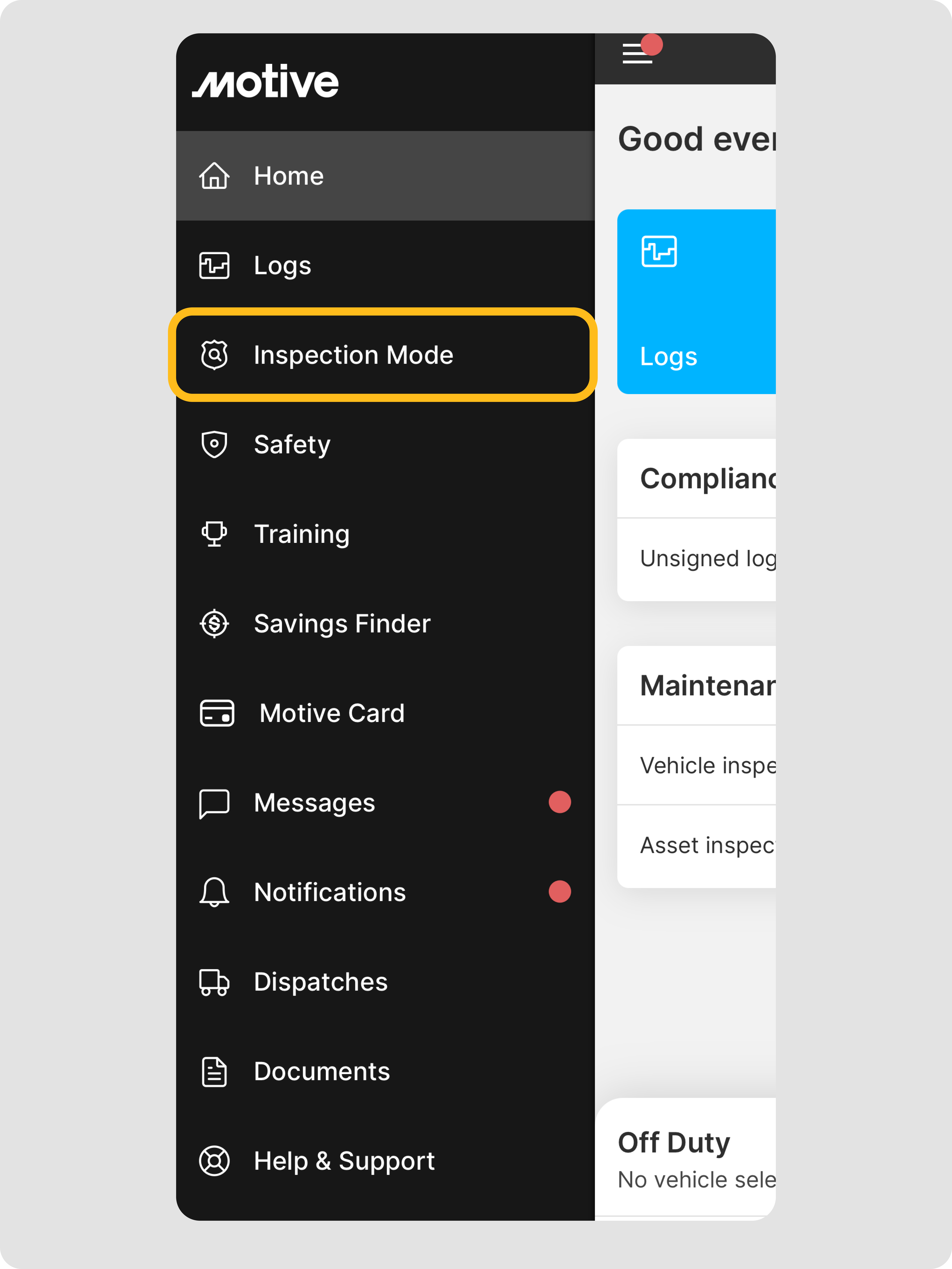 El ELD de Motive registra estos estados automáticamente. Su uso adecuado previene violaciones y evita eventos de conducción no asignados.