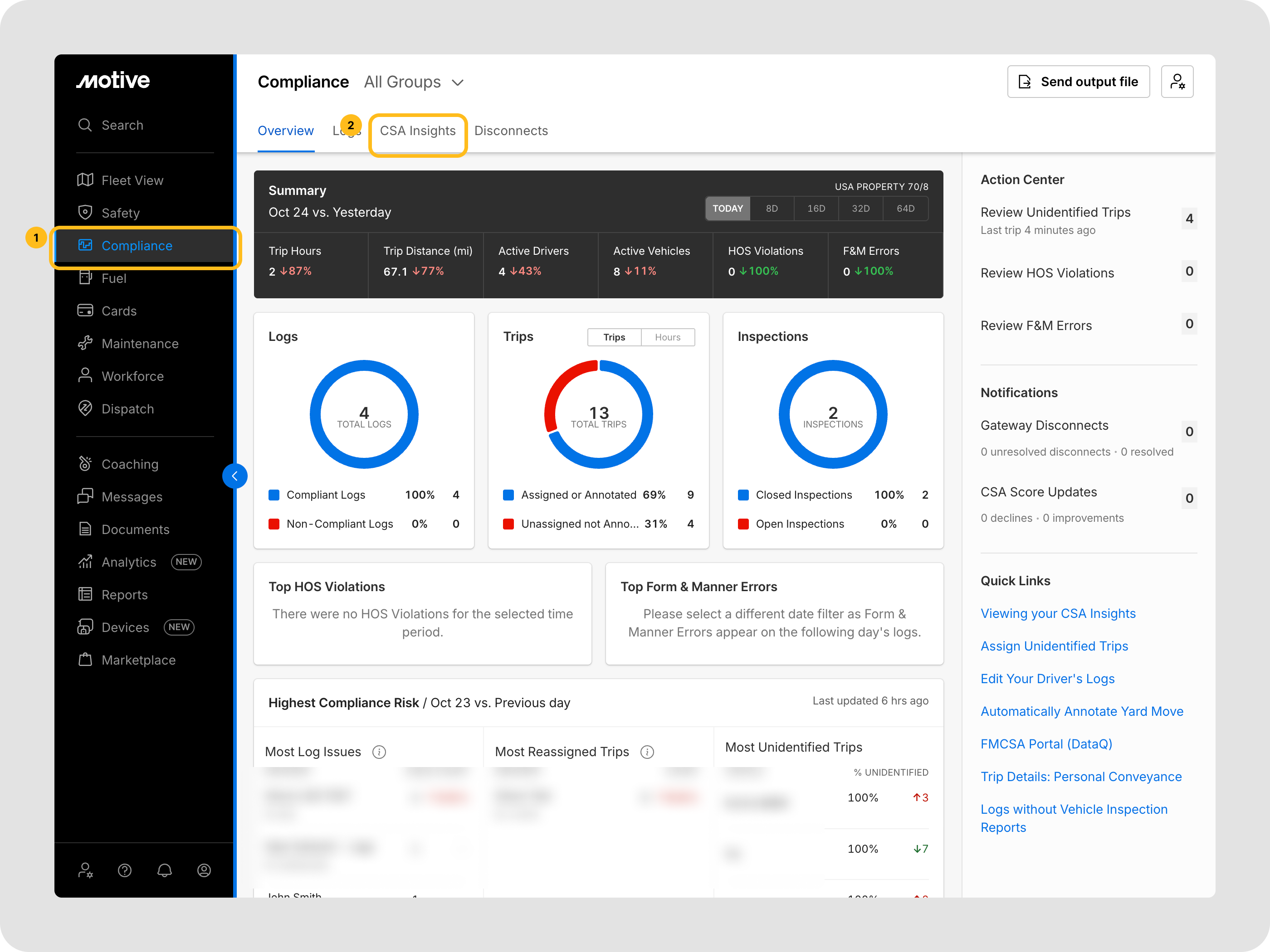 - Solo los usuarios con permisos administrativos o de cumplimiento apropiados pueden acceder a los datos de CSA Insights. Si no ve la pestaña CSA Insights, contacte al administrador de su flota.