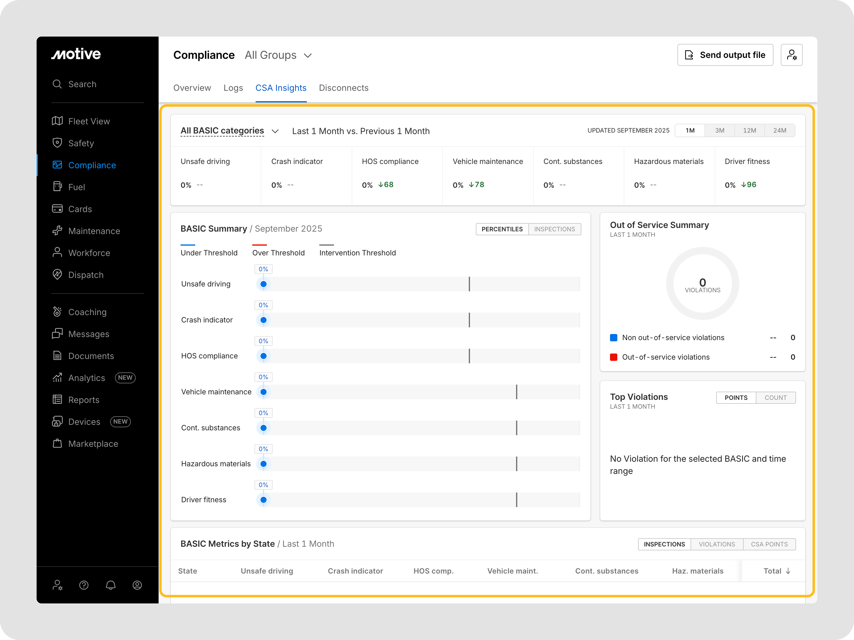 CSA Insights es una herramienta poderosa dentro de la plataforma Motive que transforma datos sin procesar del FMCSA en inteligencia accionable. Al aprovechar CSA Insights, las flotas pueden pasar de reaccionar a las infracciones a prevenir proactivamente los riesgos de seguridad, reduciendo las puntuaciones, disminuyendo accidentes y fortaleciendo el cumplimiento.
