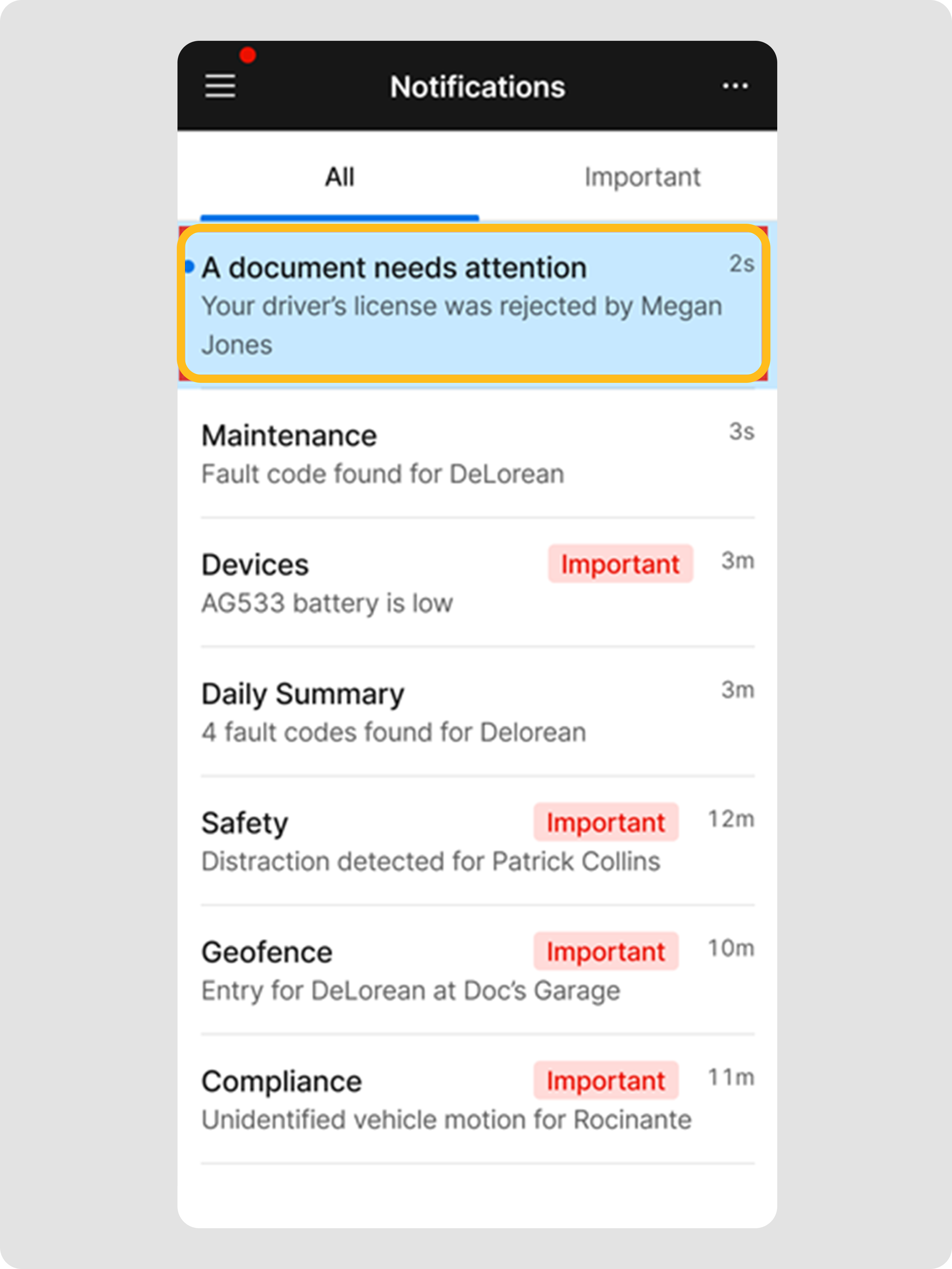 - Cuando el documento es rechazado por el usuario de flota tras la revisión, el conductor recibe una notificación en la aplicación Driver con la razón del rechazo.