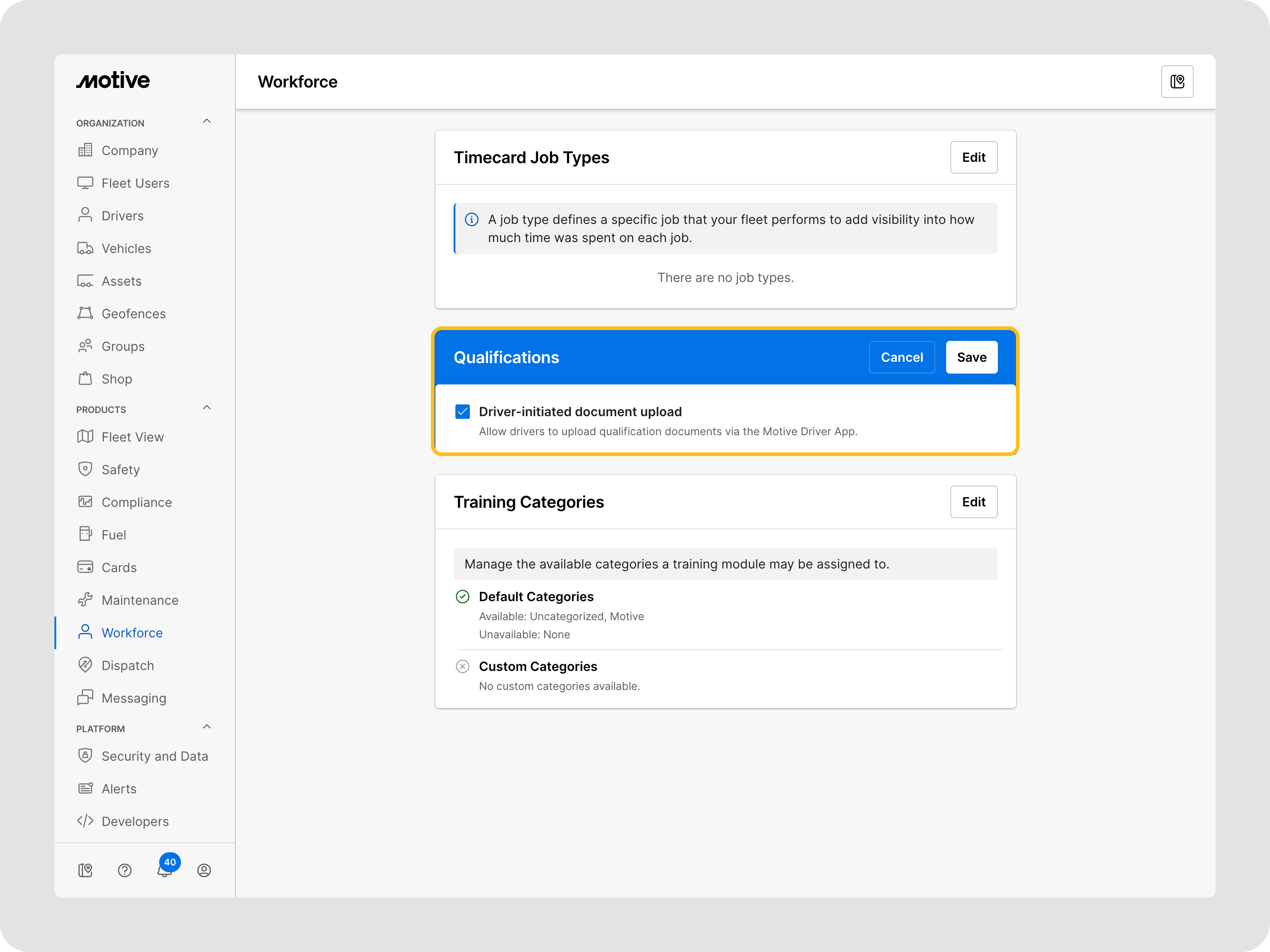 - Inicie sesión en el Panel de Control de Flotas Motive y vaya a Workforce > Qualifications.