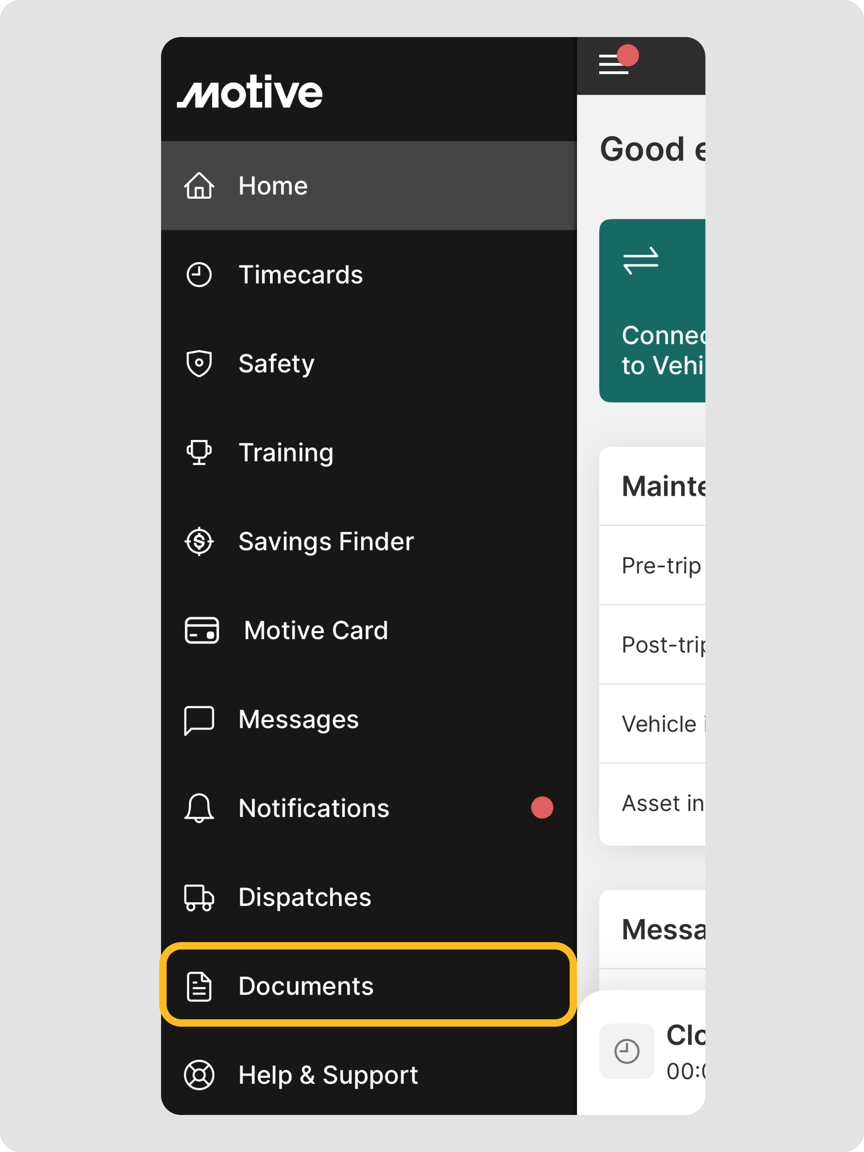 Inicie sesión en la aplicación Driver y vaya a Documentos desde la pantalla principal o el menú de navegación principal.