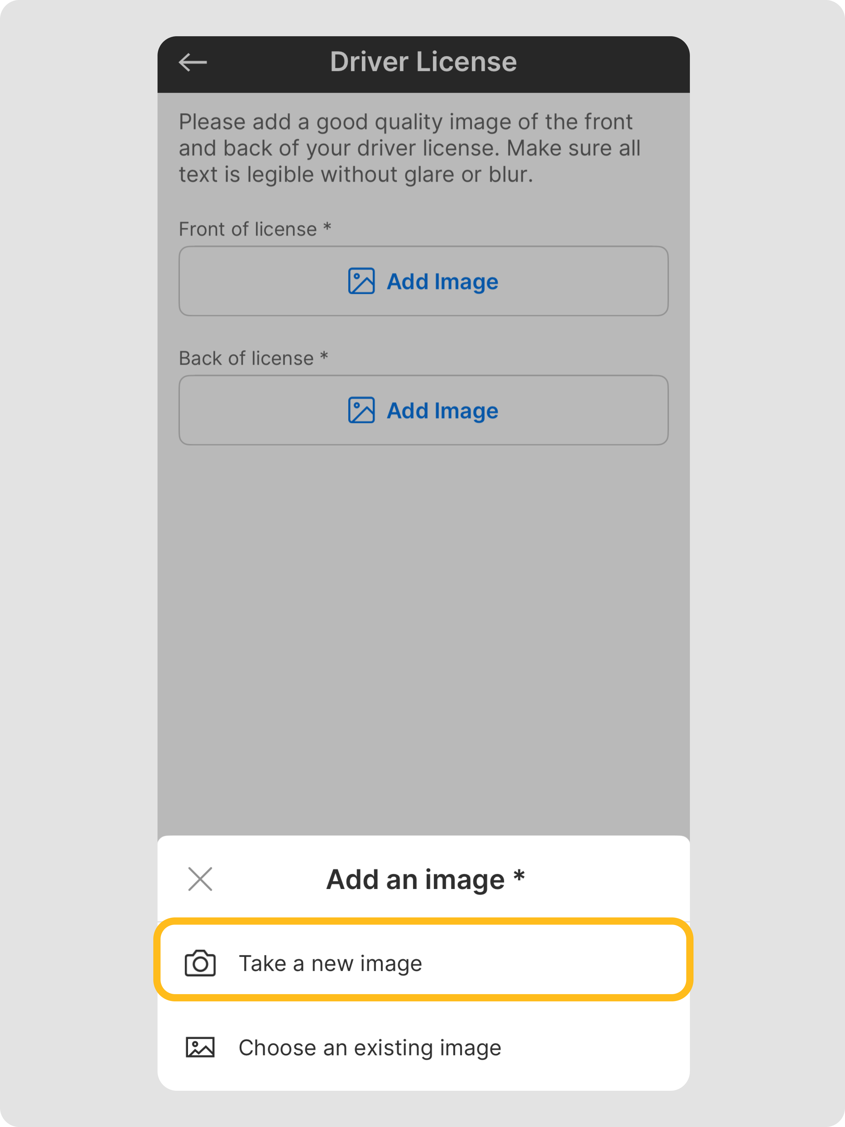 Aparecerá la pantalla Documento, solicitando al conductor subir una imagen del documento. Los conductores deben asegurarse de que el documento esté actualizado, con toda la información visible y no borrosa ni oscura, luego toque Agregar imagen.
