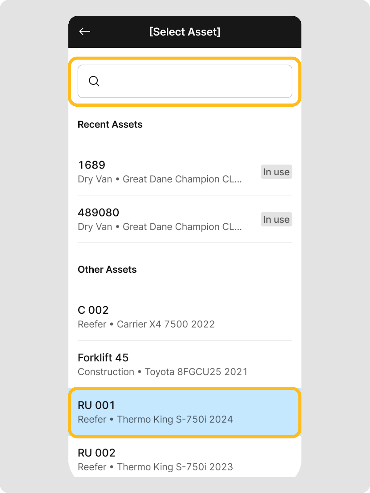 Si el activo refrigerado está actualmente asignado a otro vehículo, aparecerá una ventana emergente de ‘Activo en uso’ cuando intentes seleccionarlo. Si estás seguro de que la unidad refrigerada debe asignarse a tu vehículo actual, toca ‘Seleccionar de todos modos’ para asignarla a tu vehículo.