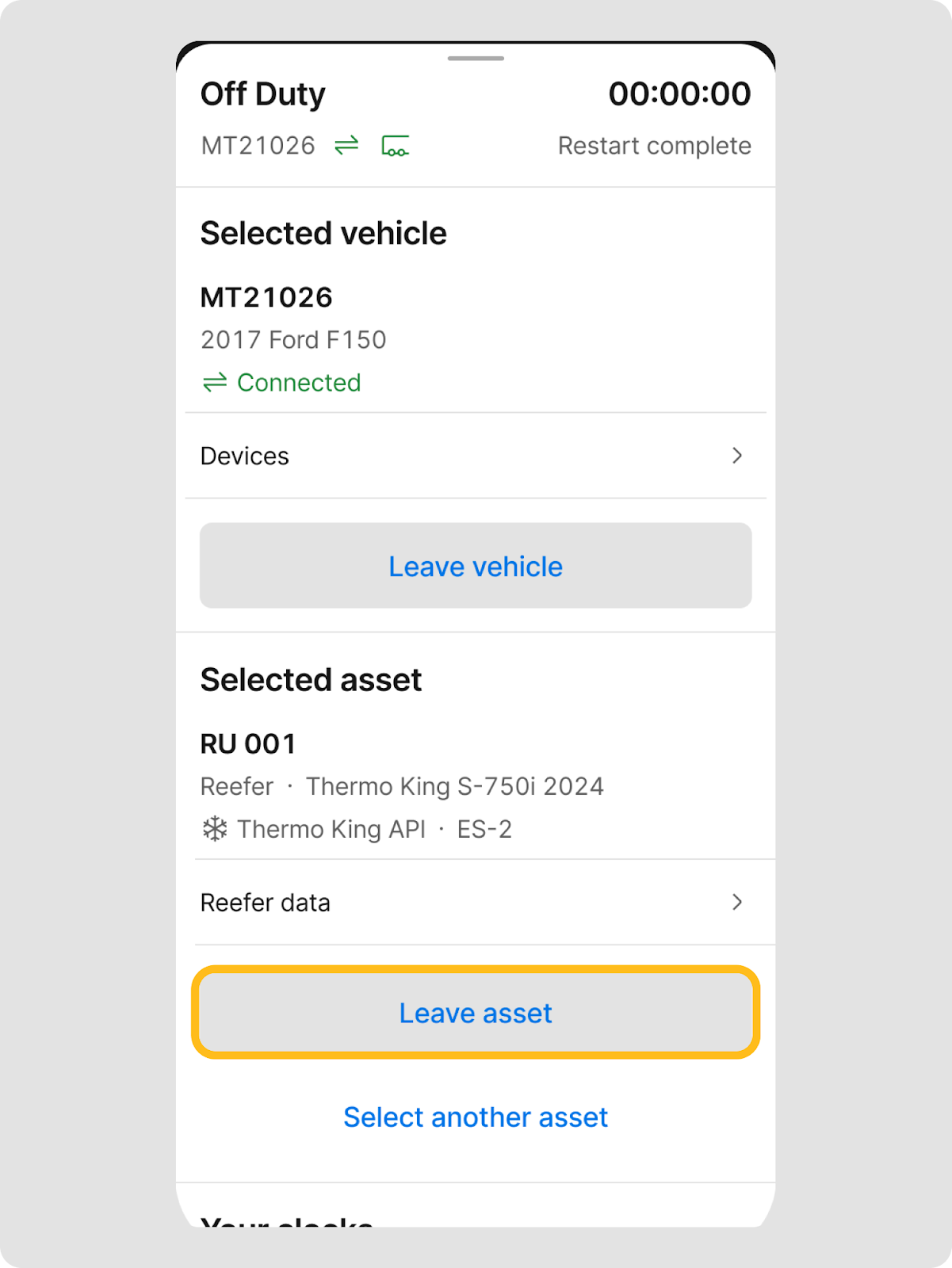 | Nota: Para acceder a los datos de la unidad refrigerada, los conductores deben asignar el activo refrigerado a su vehículo durante el viaje. Para habilitar esta función para tu flota, contacta al soporte de Motive. |