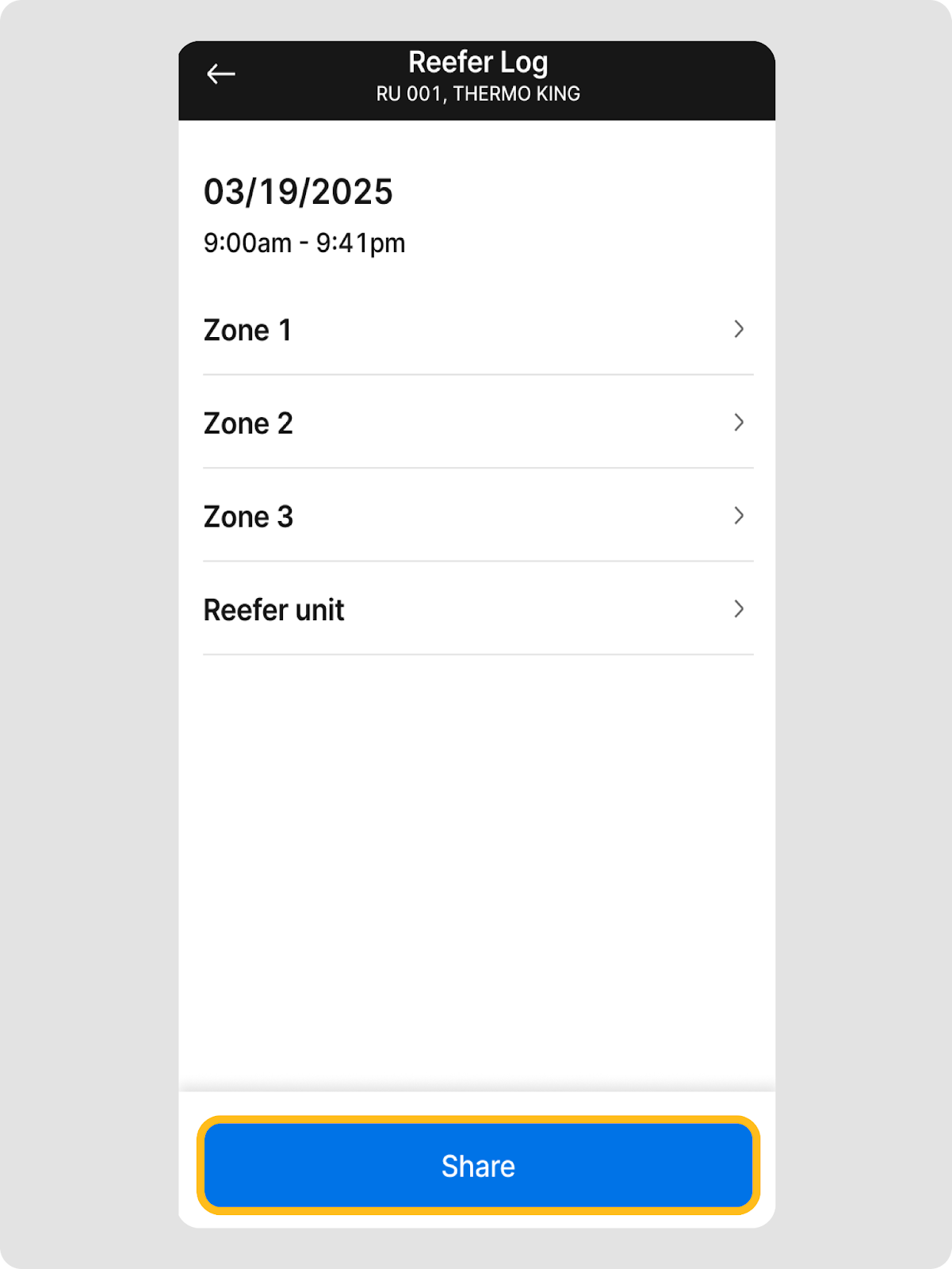 Los registros compartidos de la unidad refrigerada incluyen datos clave de la unidad y temperatura para un rango de tiempo seleccionado. Antes de compartir el archivo del registro, puedes tocar ‘Unidad refrigerada’ o cualquiera de las zonas listadas para ver la información que vas a compartir.