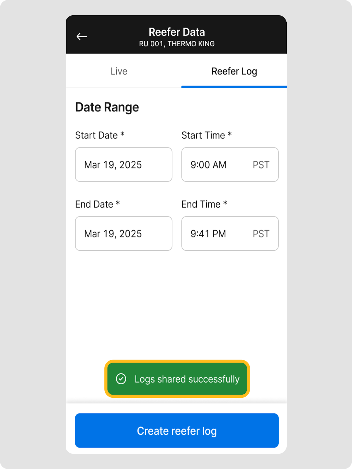 - Selecciona un Fecha y un Rango de hora y toca Crear registro de la unidad refrigerada.