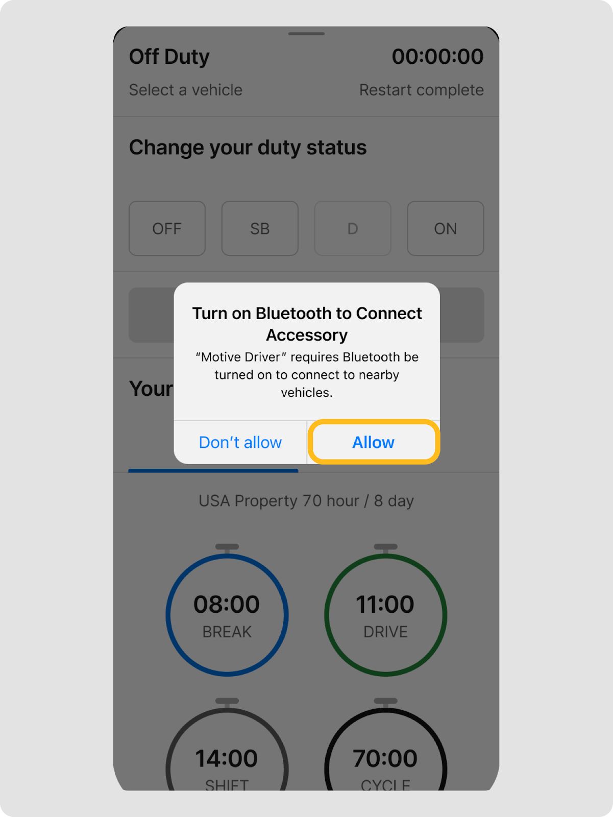 - Toca Permitir para habilitar los permisos de Bluetooth y conectar con tu vehículo. Este paso único solo aparece si el Bluetooth está deshabilitado para la aplicación Motive Driver.
