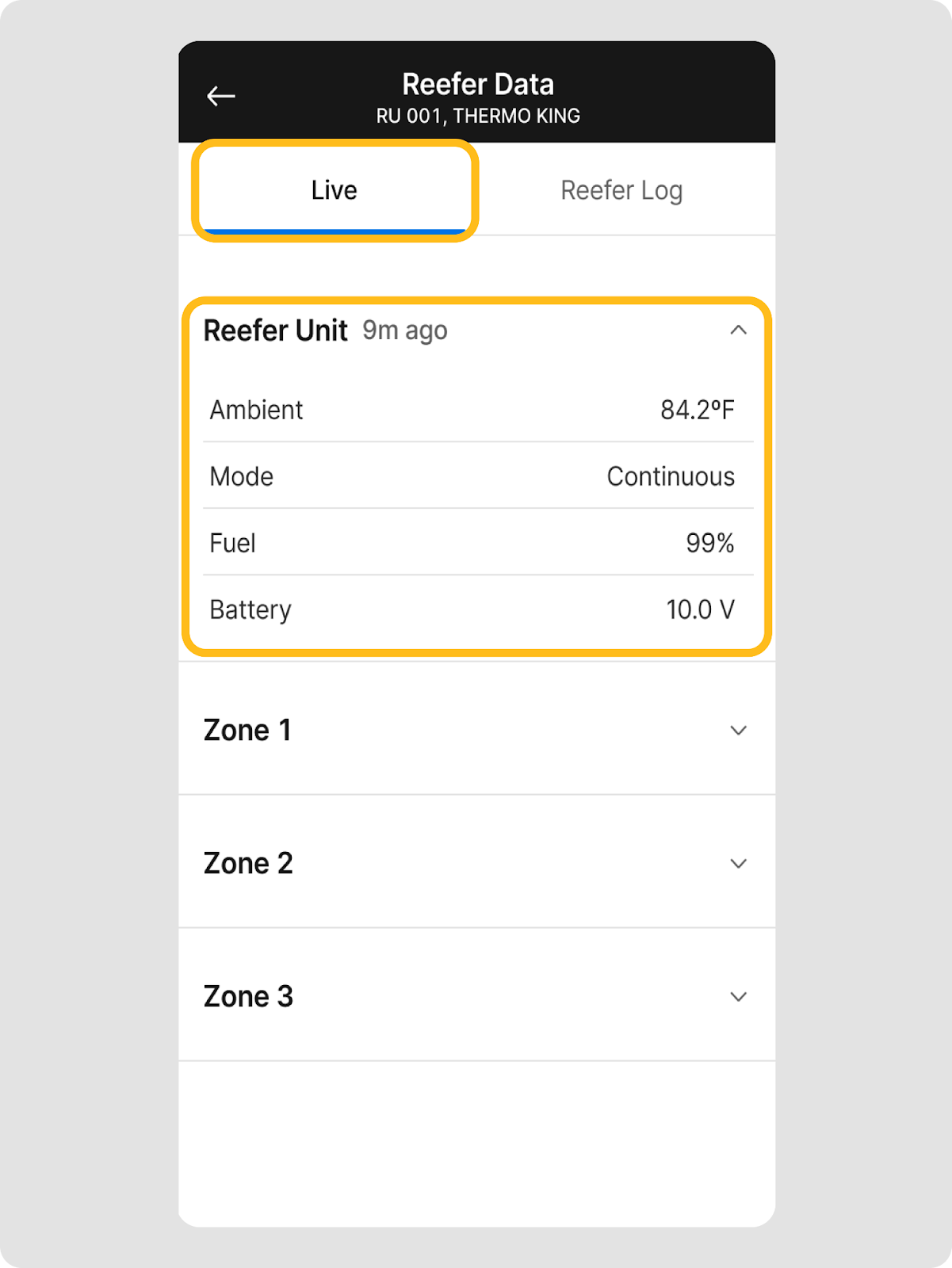 Sí. Para unidades refrigeradas de múltiples zonas, cada zona aparece como un elemento separado en la pestaña En vivo bajo Datos de la unidad refrigerada. Toca cualquier zona para expandir y ver el estado y las lecturas de temperatura de esa zona específica.