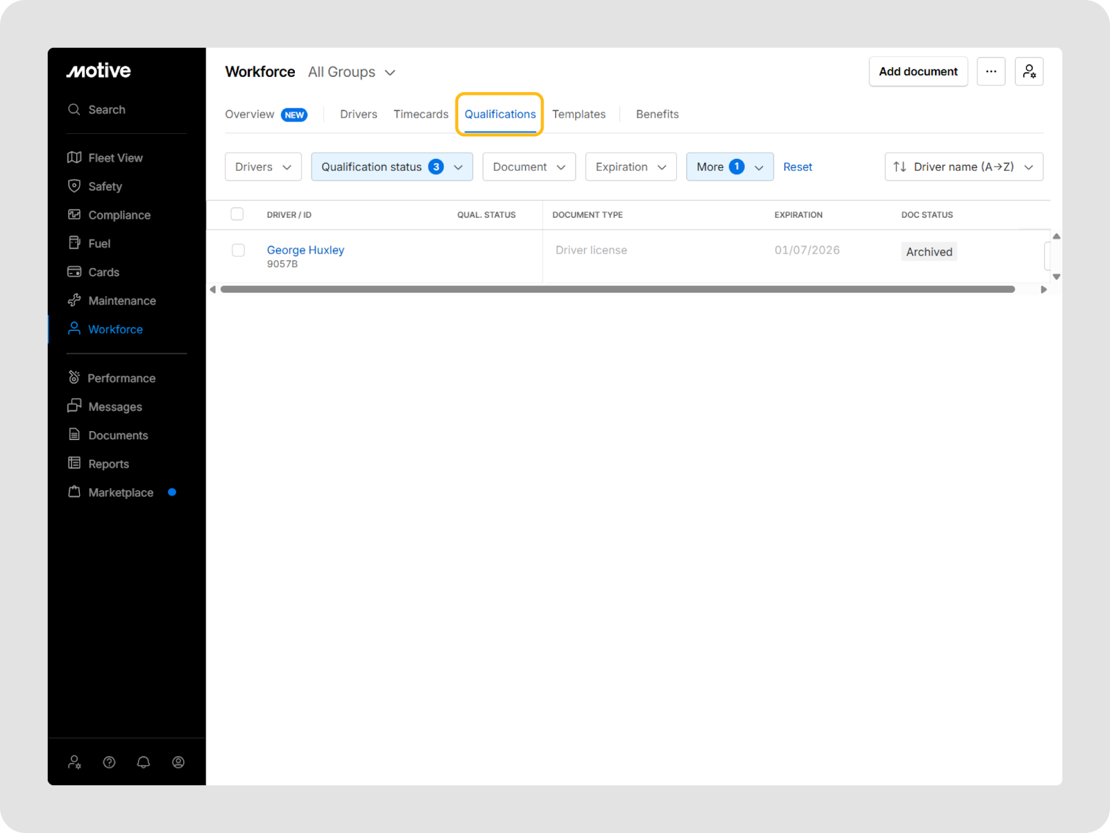 Con esta actualización, las flotas en el nivel gratuito de Gestión de la Fuerza Laboral pueden capturar licencias de conducir en el Panel de Flota o a través de la Motive Aplicación para Conductores, rastrear el estado de los documentos y configurar alertas de vencimiento de licencias, simplificando la calificación, incorporación y cumplimiento de los conductores.