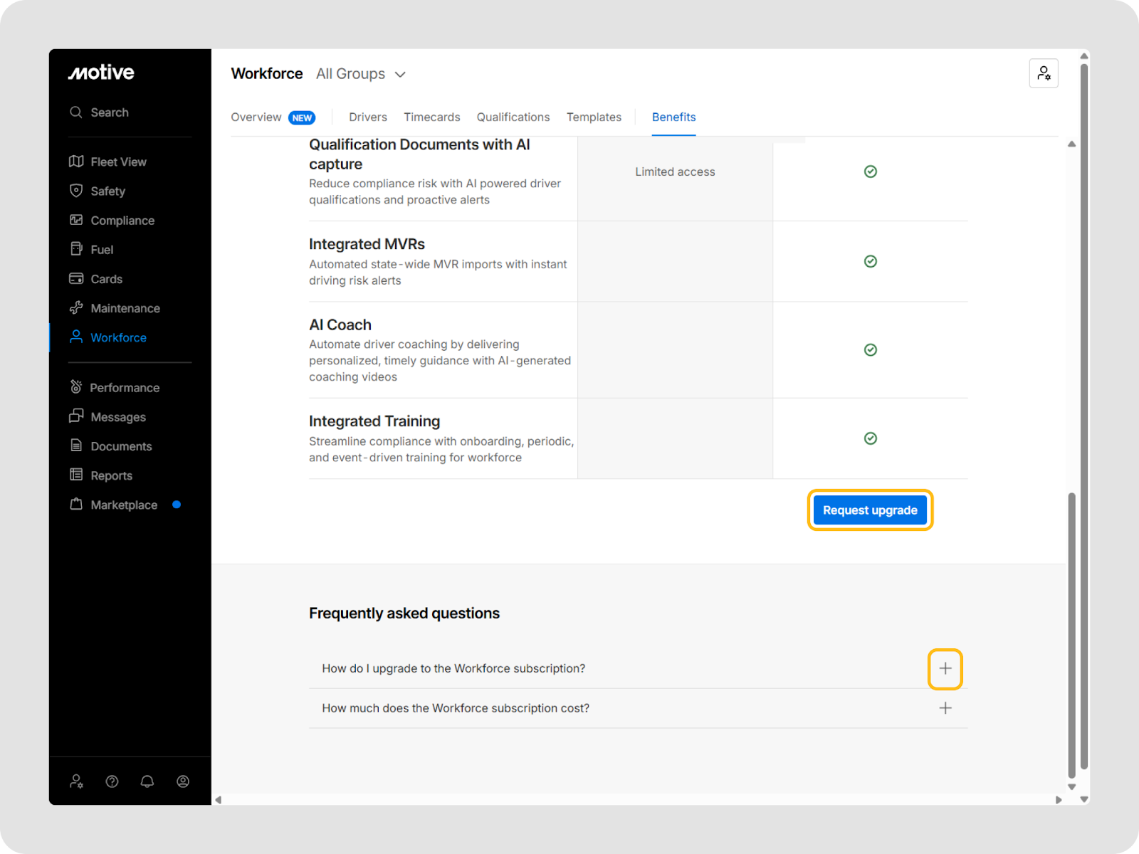 La pestaña Beneficios muestra lo que está incluido en el nivel gratuito de WFM y lo que obtiene con la suscripción pagada de WFM (calificación completa de conductores, MVRs, capacitación, entrenamiento y más). Desde esta pestaña, puede hacer clic en Solicitar actualización para actualizar a una suscripción WFM.