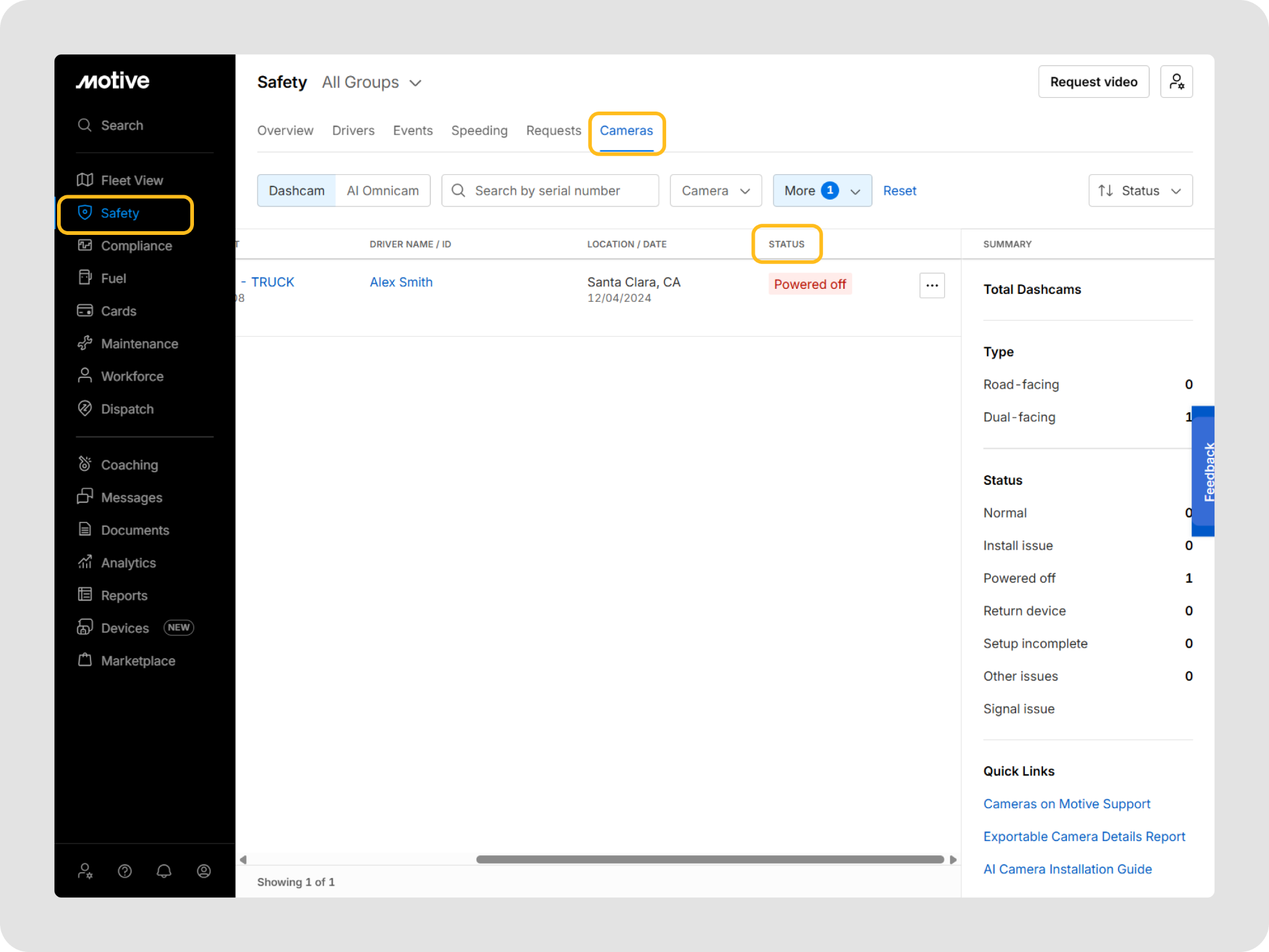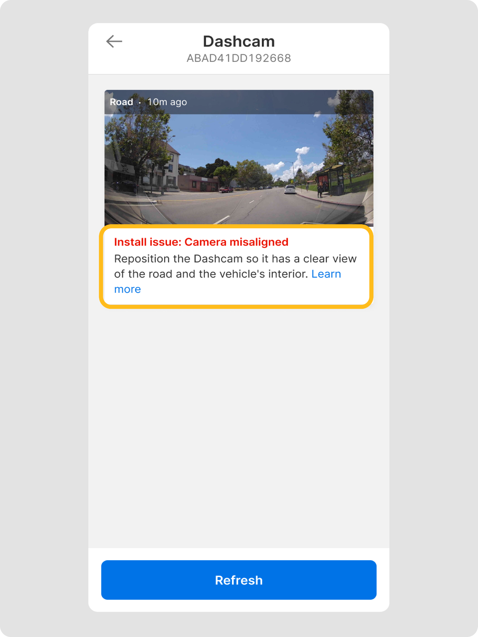 - Dispositivos > Detalles de la Puerta de Vehículo - sección Dashcam: Muestra estados de cámara alineados, apagados, problemas de instalación y otros problemas en la Aplicación de Flota.
