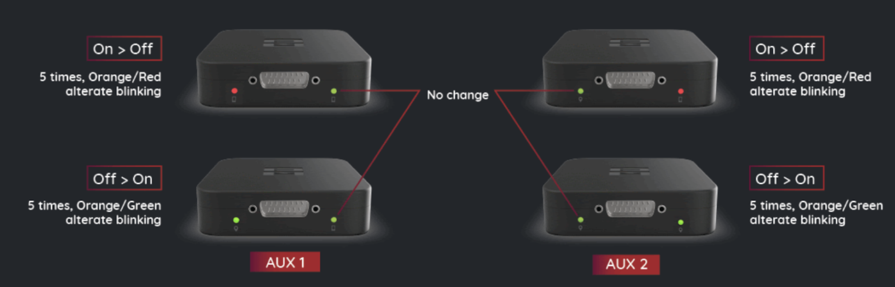 Una vez que el Cable-5005 está conectado y enchufado al Vehicle Gateway y a un cable (Cable-3XXX) existente en el vehículo, encienda el equipo PTO y observe los siguientes patrones en las luces LED del Vehicle Gateway para confirmar que se detecta la entrada del PTO.