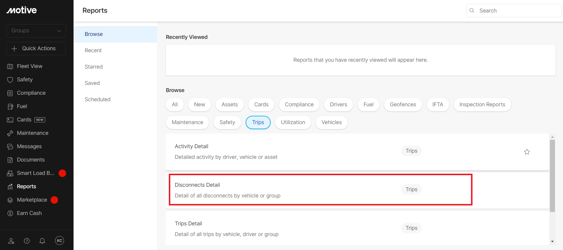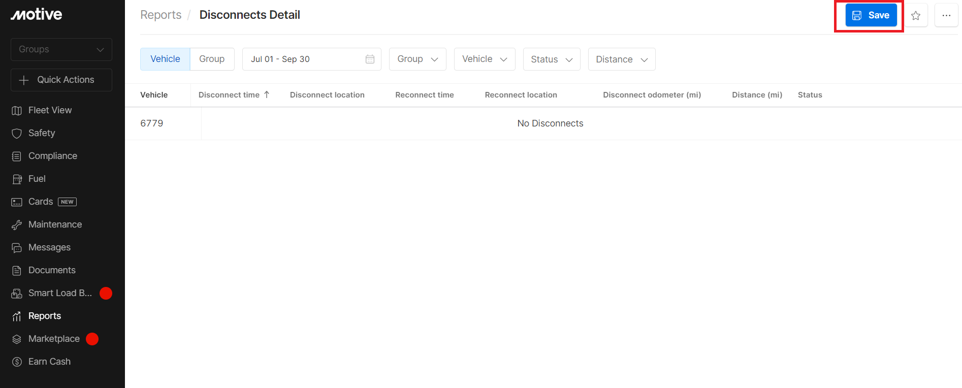 1. Connectez-vous au tableau de bord Motive Fleet et cliquez sur Rapports dans le menu latéral gauche.