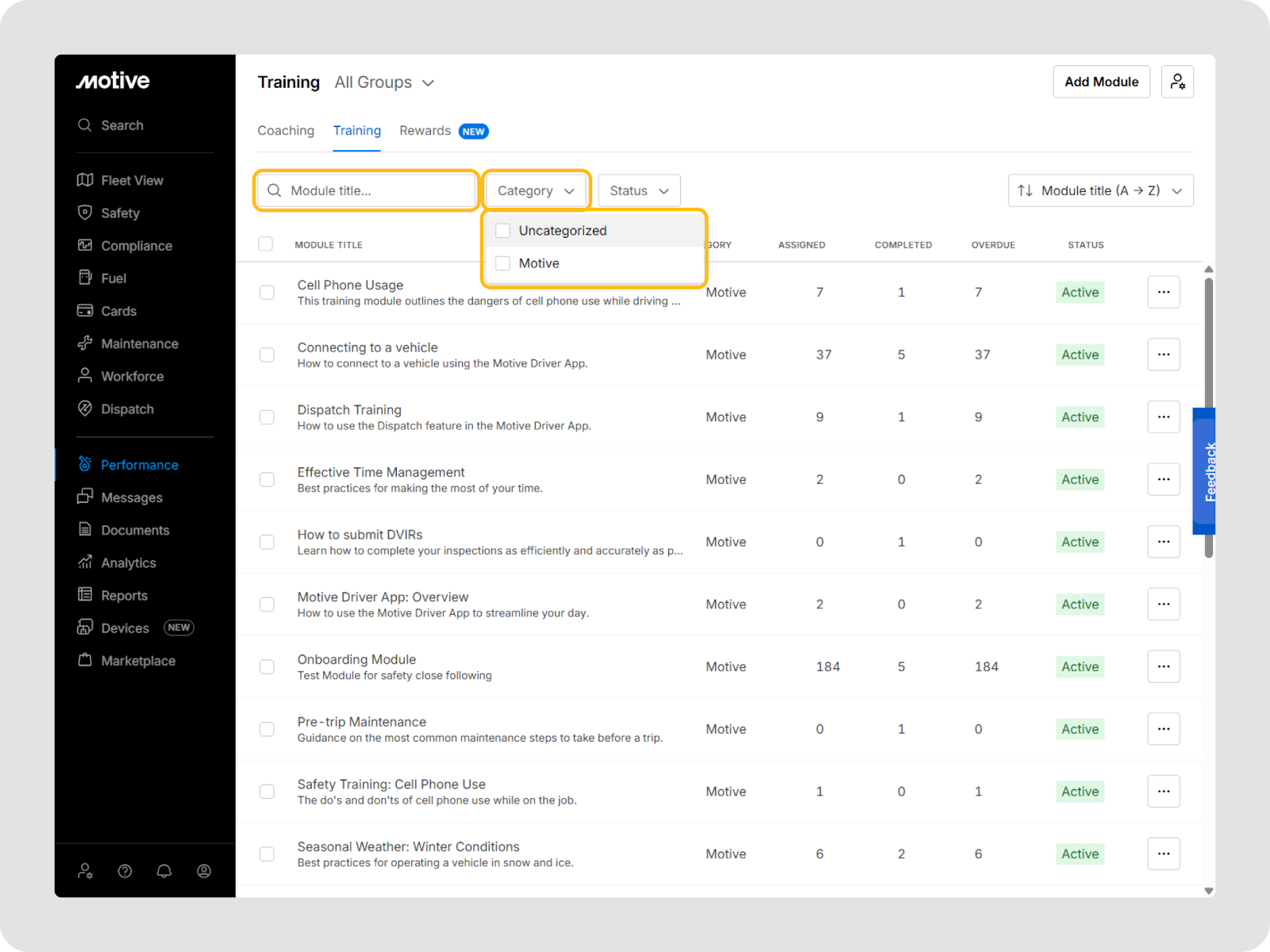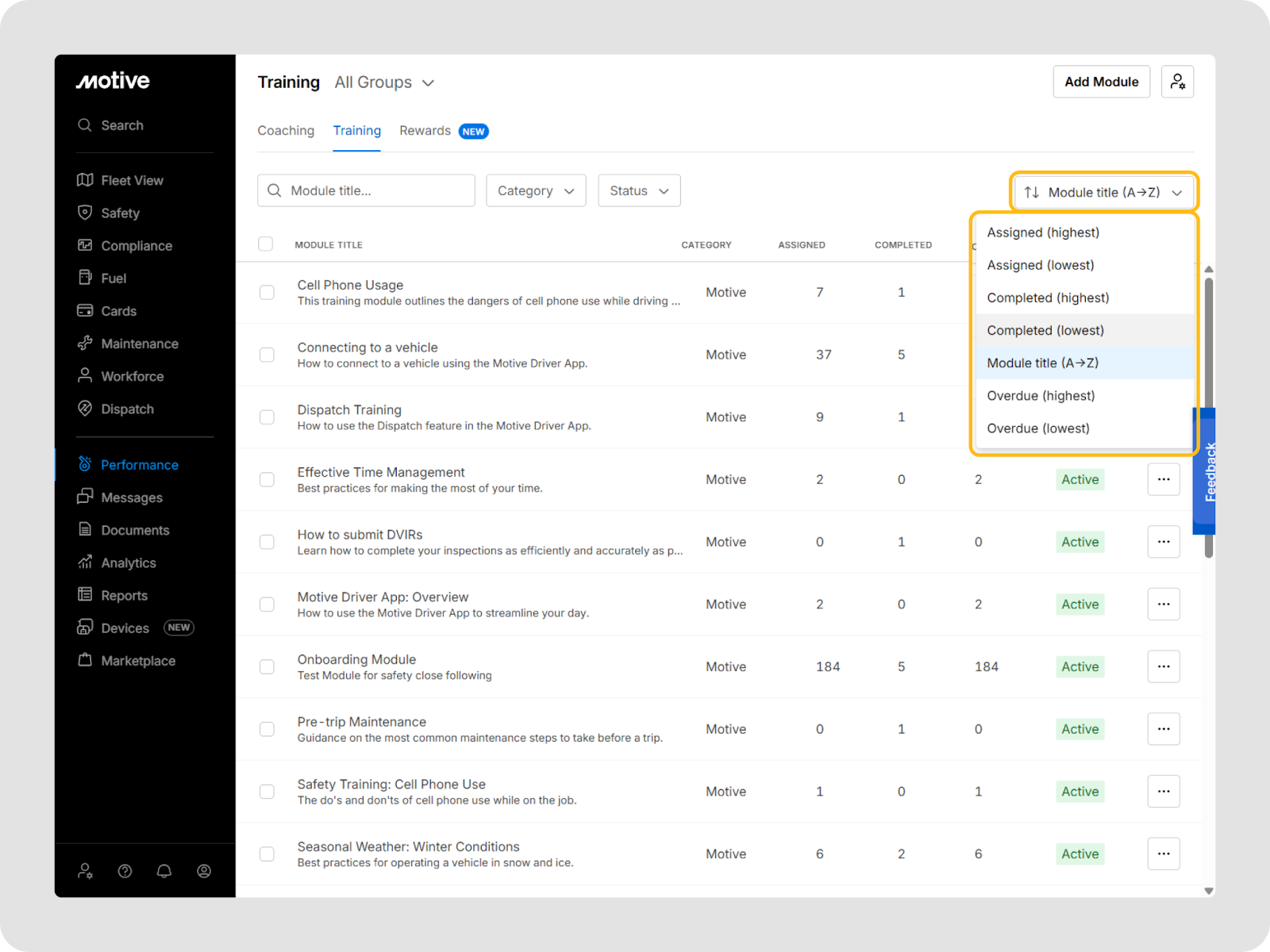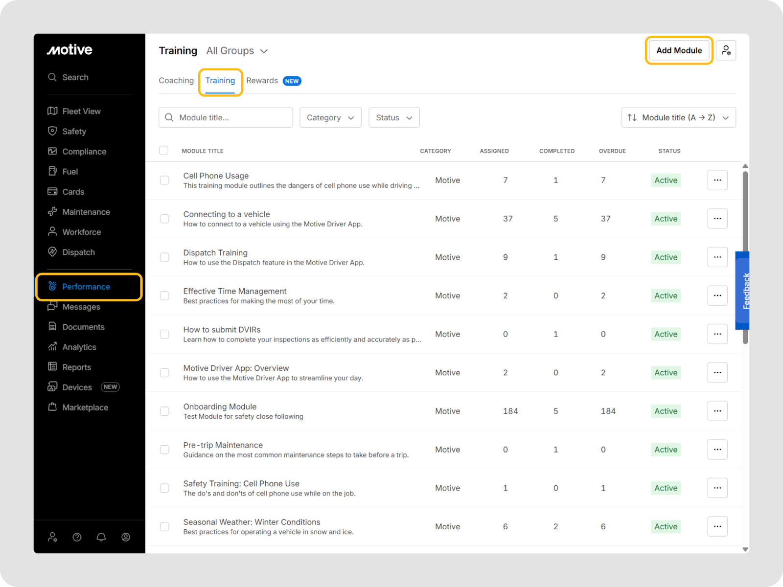 Dans le tableau de bord de la flotte, allez dans Performance > Formation pour voir et gérer tous les modules de formation. À partir de là, les administrateurs peuvent créer des modules, modifier les existants et voir d’un coup d’œil les formations attribuées, complétées et en retard.