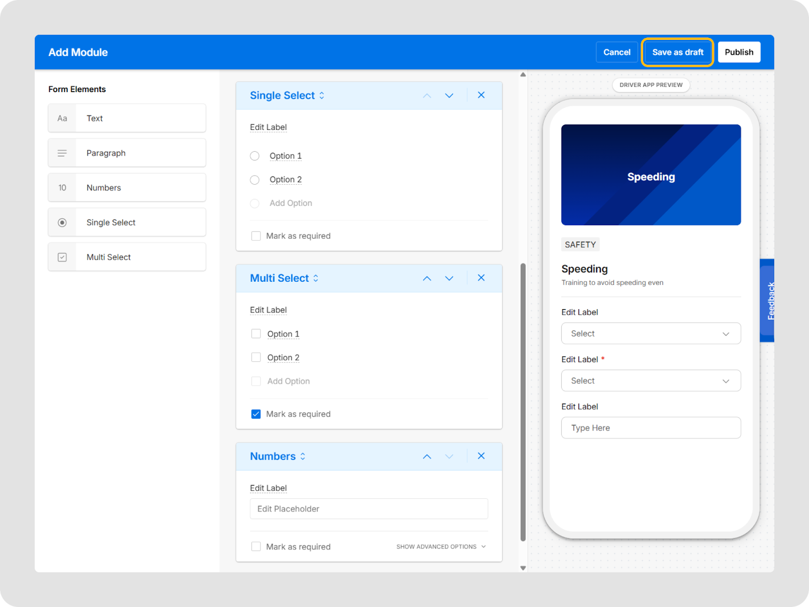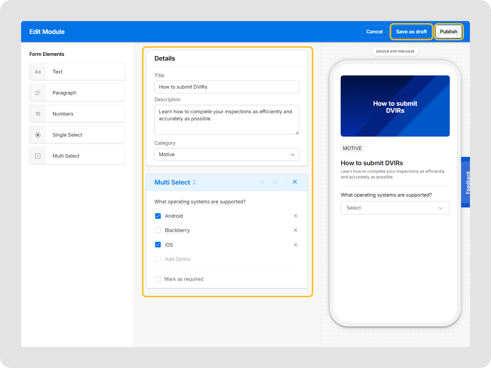 - Brouillon : Modules en cours de travail où vous pouvez modifier entièrement les titres, descriptions, catégories, médias, miniatures et évaluations. Cependant, les modules Brouillon ne peuvent pas être attribués aux conducteurs.