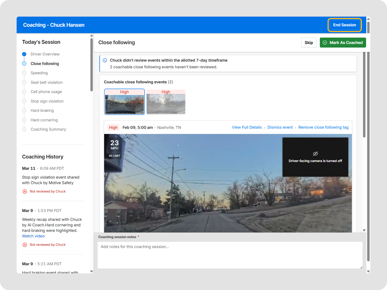 - Connectez-vous au tableau de bord de la flotte et allez dans Performance > Coaching.