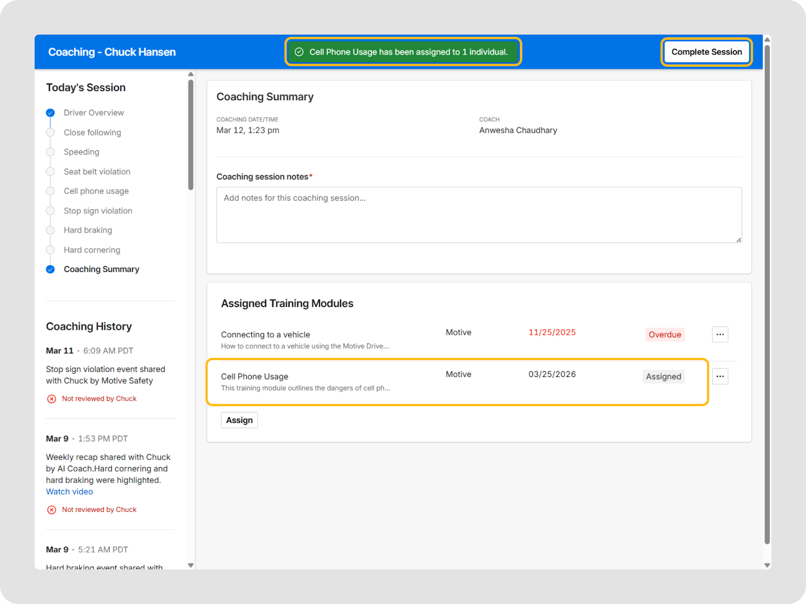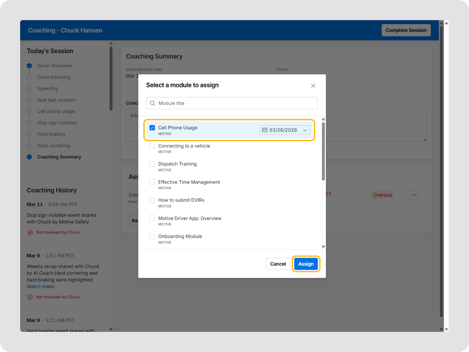 - Attributions flexibles : Attribuez des modules depuis l’onglet Formation ou le Résumé du coaching à des conducteurs individuels ou à des groupes, avec des dates d’échéance qui prennent en charge à la fois les programmes planifiés et les suivis déclenchés par des événements.