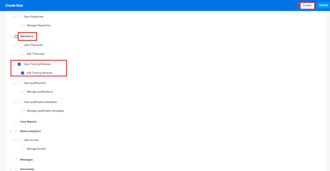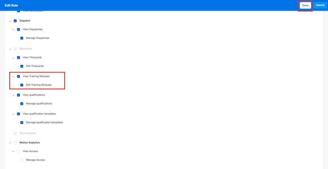 6. Faites défiler jusqu’à la section Main-d’œuvre . Cochez les cases pour Voir les modules de formation et Modifier les modules de formation.