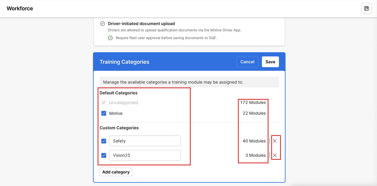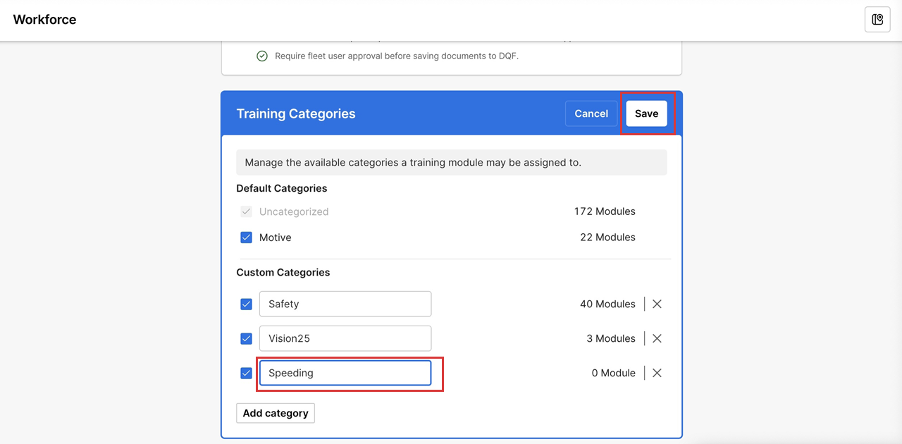 - Gestion des catégories : Configurez les catégories de formation par défaut et personnalisées dans les paramètres de la main-d'œuvre afin que les modules soient clairement organisés pour l’attribution, les rapports et la découverte.