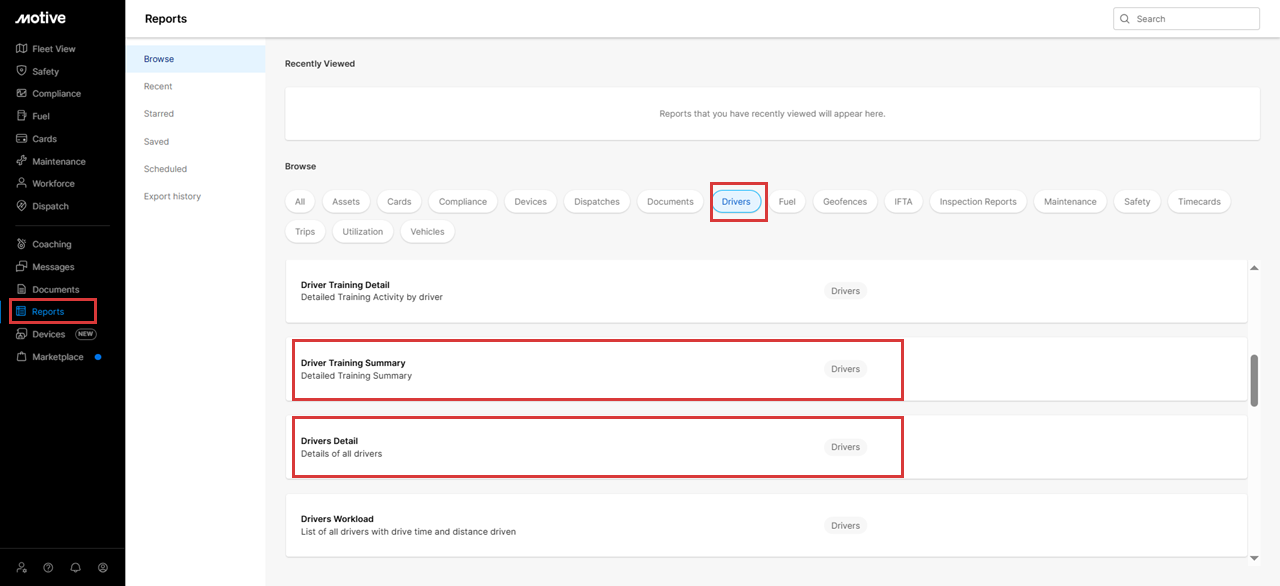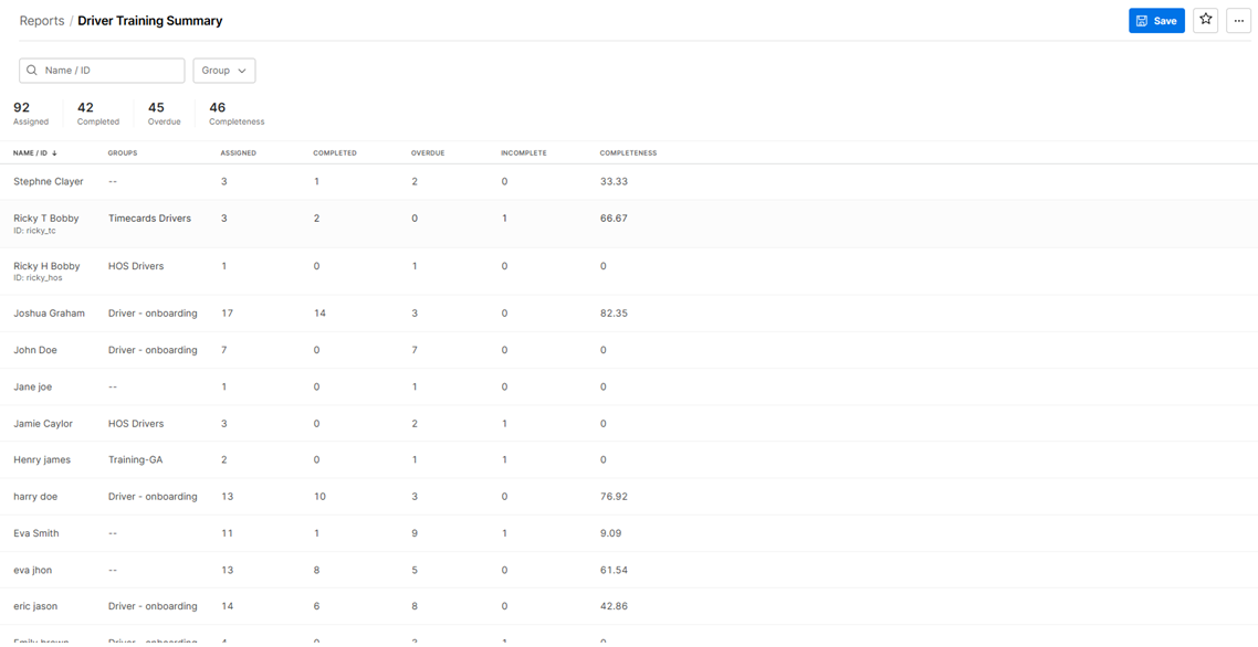 4. Ouvrez le rapport Détail de formation des conducteurs pour voir l’activité de formation détaillée par conducteur et le rapport Résumé de formation des conducteurs pour vérifier le résumé de la progression de la formation à travers différents conducteurs ou groupes.