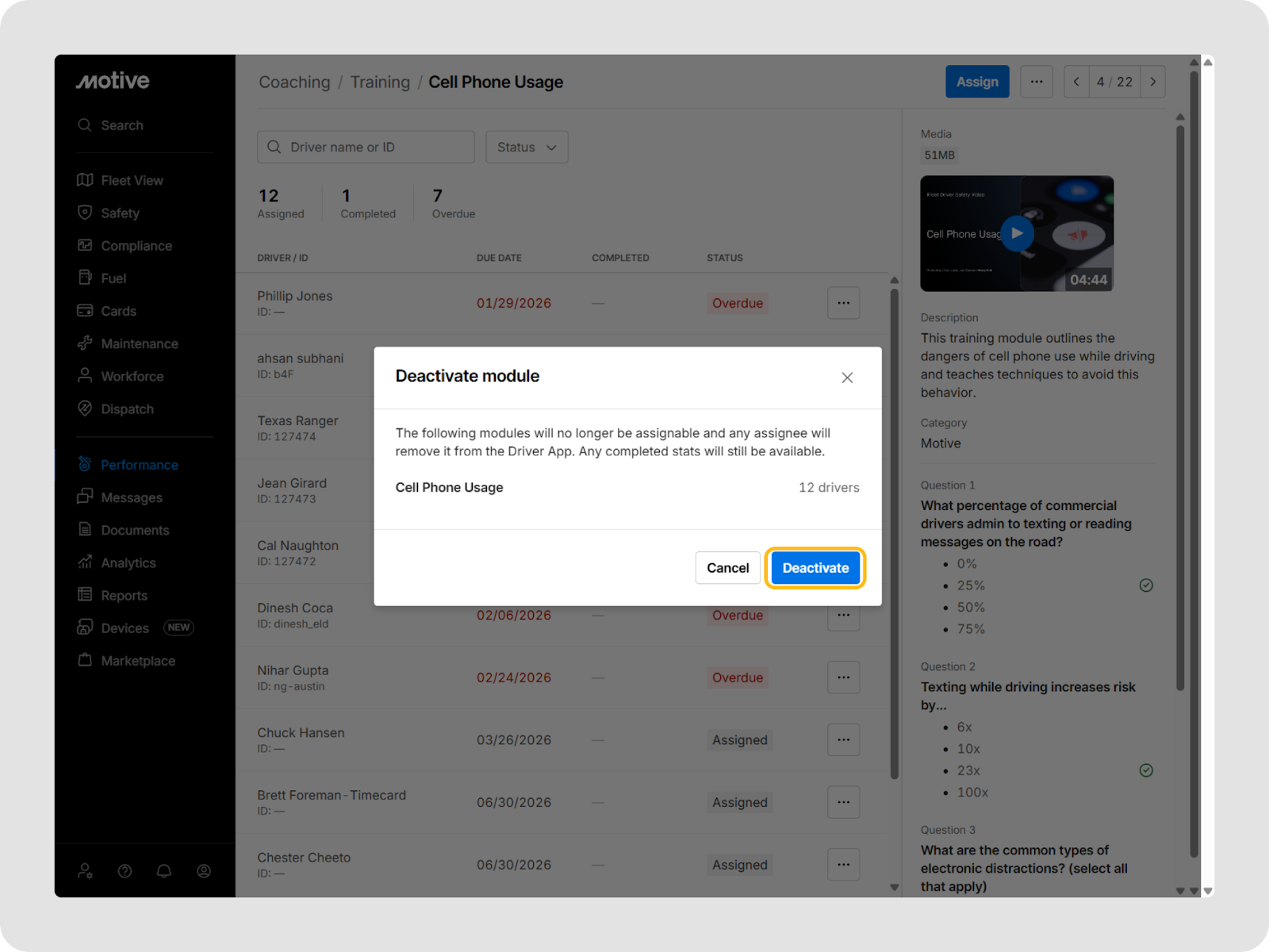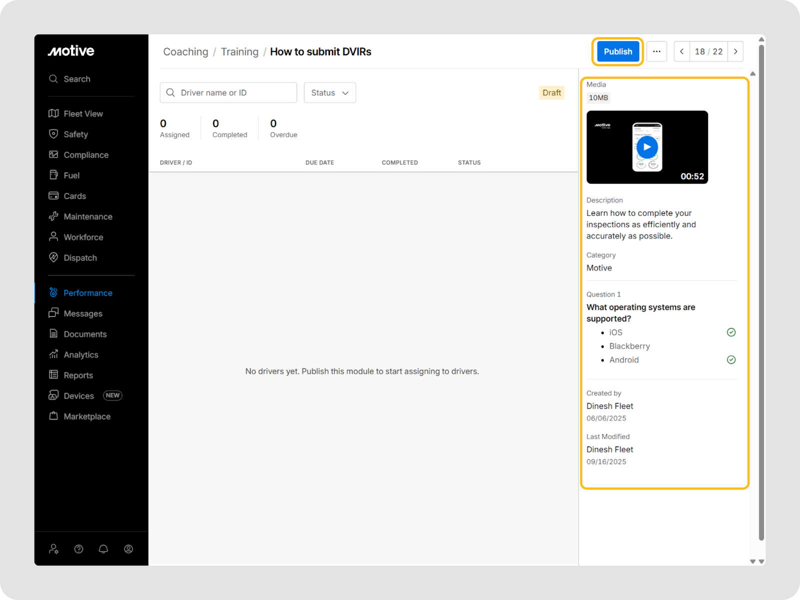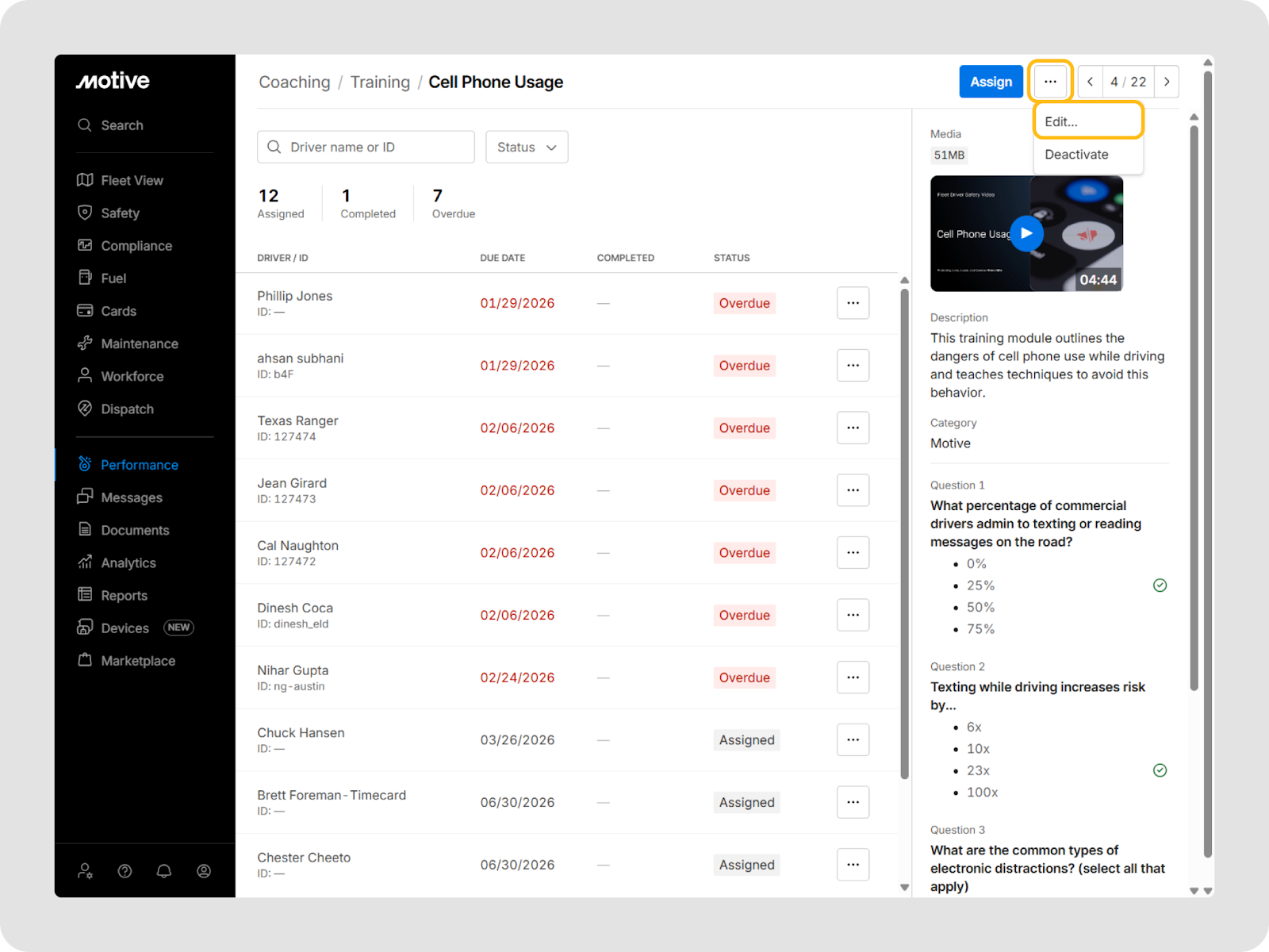 La formation intégrée dans le Motive Performance hub aide les flottes à créer, attribuer et suivre la formation des conducteurs en un seul endroit, afin de fournir une éducation cohérente, renforcer la sécurité et la conformité, et surveiller l'achèvement sans dépendre d'outils d'apprentissage séparés ou de suivi manuel.