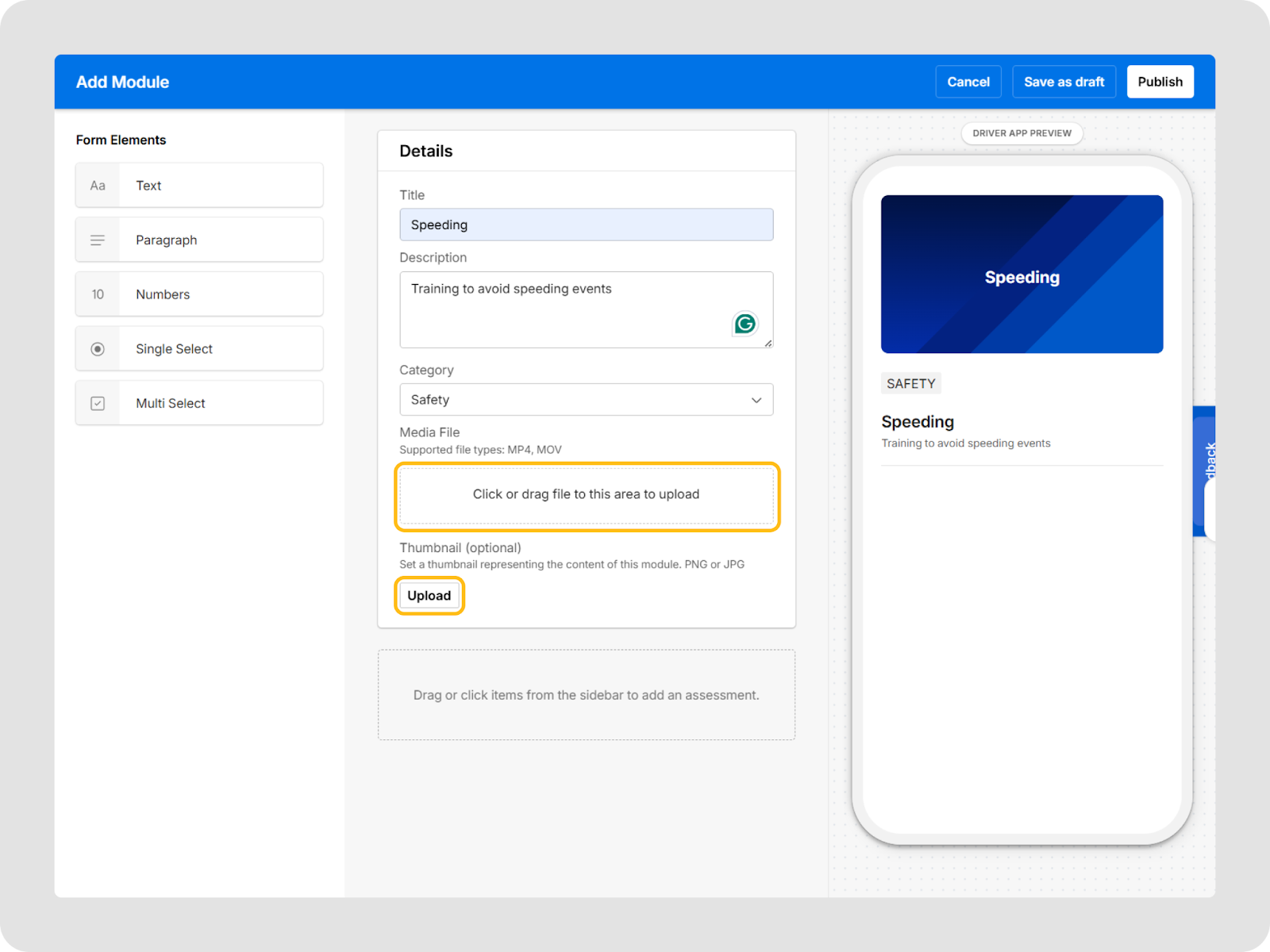 - Dans Fichier média, cliquez ou faites glisser le fichier vidéo pour télécharger la vidéo du module de formation.
