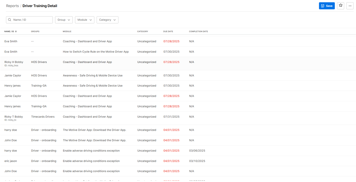 - Suivi des complétions et rapports : Utilisez les rapports Résumé de formation des conducteurs et Détail de formation des conducteurs pour surveiller les attributions, les complétions et les modules en retard, vous aidant à rester prêt pour les audits et cibler les suivis.