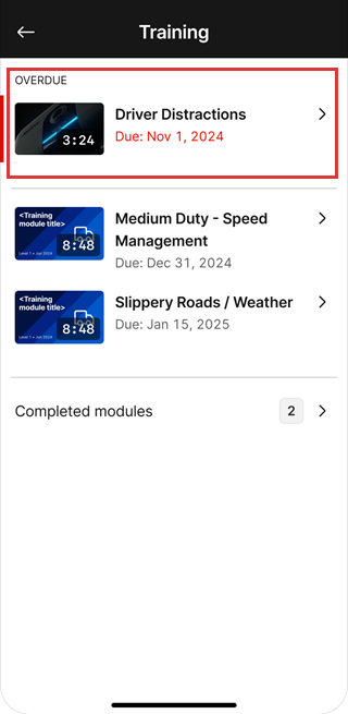 Les conducteurs ouvrent la section Formation dans l’application Conducteur Motive pour voir les modules attribués, les dates d’échéance et les éléments en retard. Ils appuient sur un module pour regarder la vidéo et compléter les évaluations. Un module ne peut être marqué comme complété que lorsque la vidéo a été entièrement visionnée et que toutes les questions d’évaluation obligatoires ont été répondues correctement.