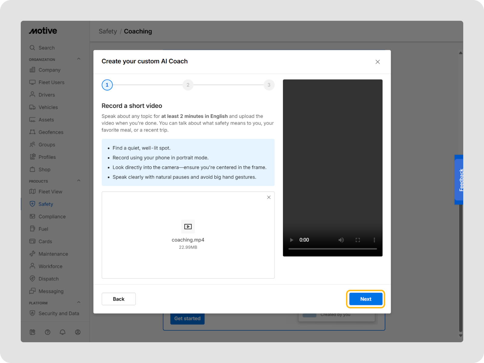 Allez dans le Tableau de bord de flotte et suivez les étapes de la section Créer un Coach IA personnalisé de cet article. Suivez les instructions à l’écran pour téléverser une courte vidéo de vous-même parlant en anglais, enregistrez une brève vidéo de consentement, puis nommez le coach. Une fois terminé, votre Coach IA personnalisé apparaît dans la liste des Coachs IA, où vous pourrez le sélectionner pour vos conducteurs.
