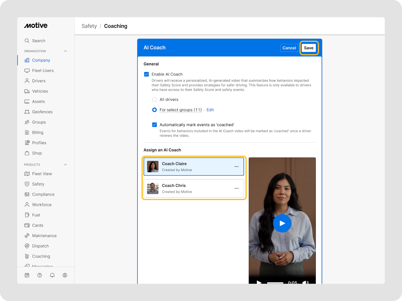 - Encadrement automatisé : Le Coach IA génère et livre automatiquement des vidéos récapitulatives de performance hebdomadaires aux conducteurs admissibles, leur fournissant ainsi un encadrement régulier et cohérent sans nécessiter une session 1:1 pour chaque événement de sécurité.