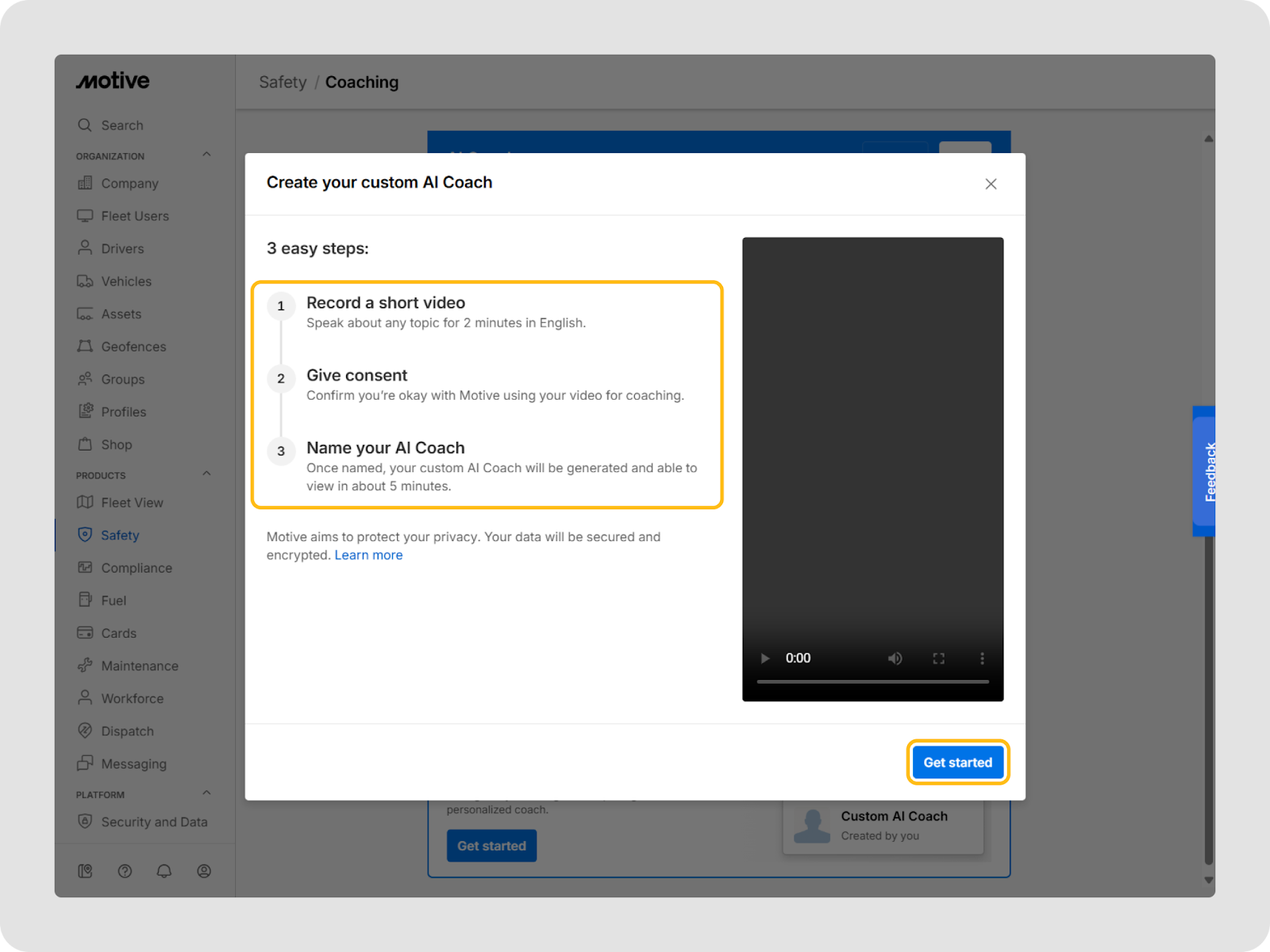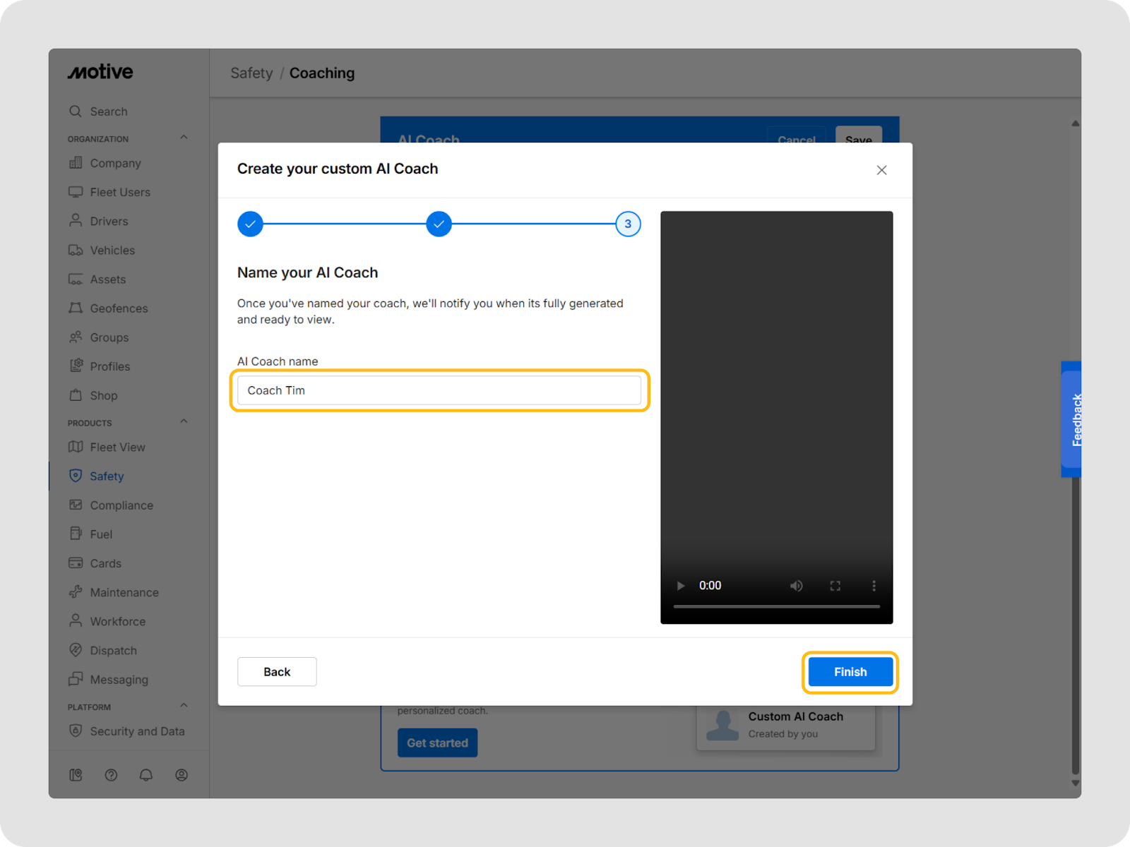 Les gestionnaires de flotte et les administrateurs peuvent configurer le Coach IA à partir du Tableau de bord de flotte pour contrôler quels conducteurs reçoivent les résumés vidéo IA et comment les événements sont suivis une fois que les conducteurs terminent leur encadrement. Lorsqu’il est activé, le résumé vidéo du Coach IA est automatiquement ajouté aux tâches de sécurité hebdomadaires des conducteurs, afin qu’ils sachent exactement quoi réviser et quand.