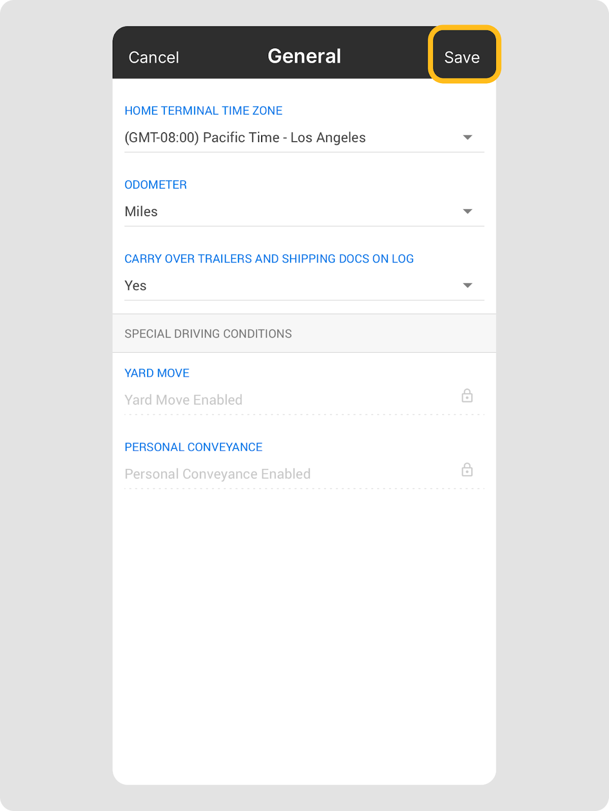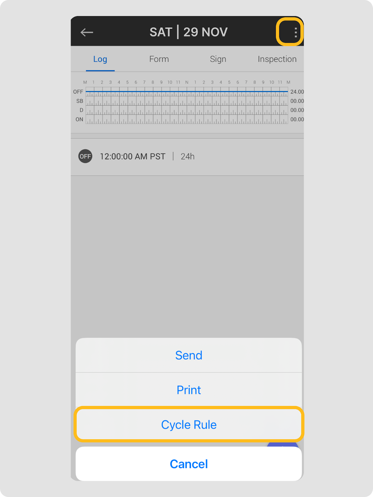 - Suivi du cycle en temps réel : Surveillez instantanément vos heures restantes et votre temps de conduite accumulé, ce qui vous aide à planifier votre journée et à rester conforme aux règles HOS.