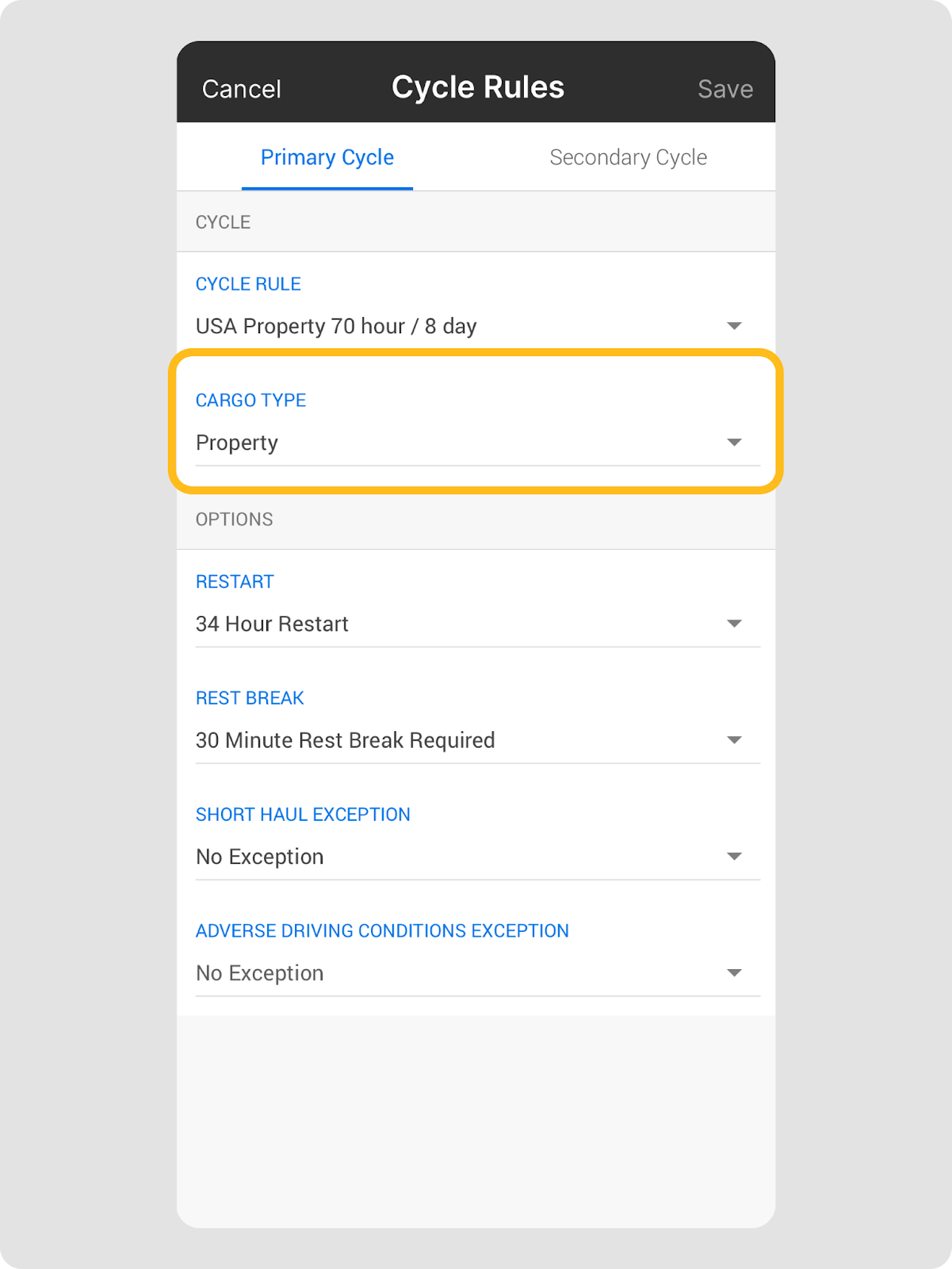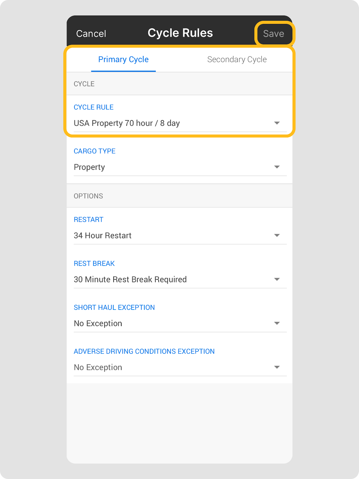 | Remarque : Confirmez toujours que le cycle sélectionné correspond à votre opération avant de changer. Une fois le cycle secondaire ajouté, les conducteurs peuvent commencer à alterner les cycles sur un journal de bord (primaire et secondaire) pour n’importe quel jour actuel ou passé. |