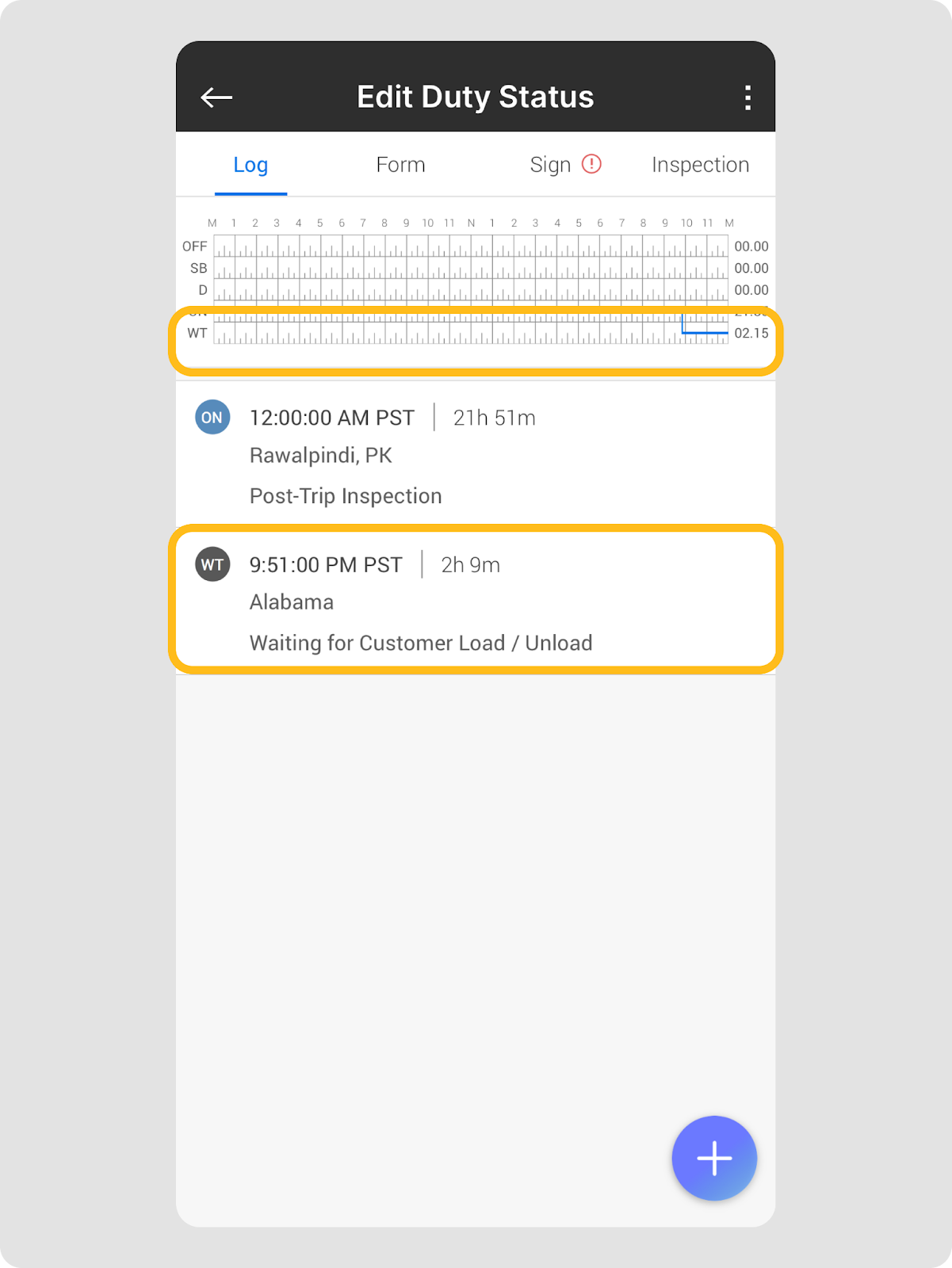 | Remarque : Le temps d’attente n’affecte pas les calculs d’appariement Split Sleeper Berth. En effet, seul le statut de service Sleeper Berth est utilisé pour les appariements Split Sleeper Berth sous la règle Texas 70/7. Le temps d’attente apparaît sur la cinquième ligne du journal pour le différencier du statut hors service standard. |