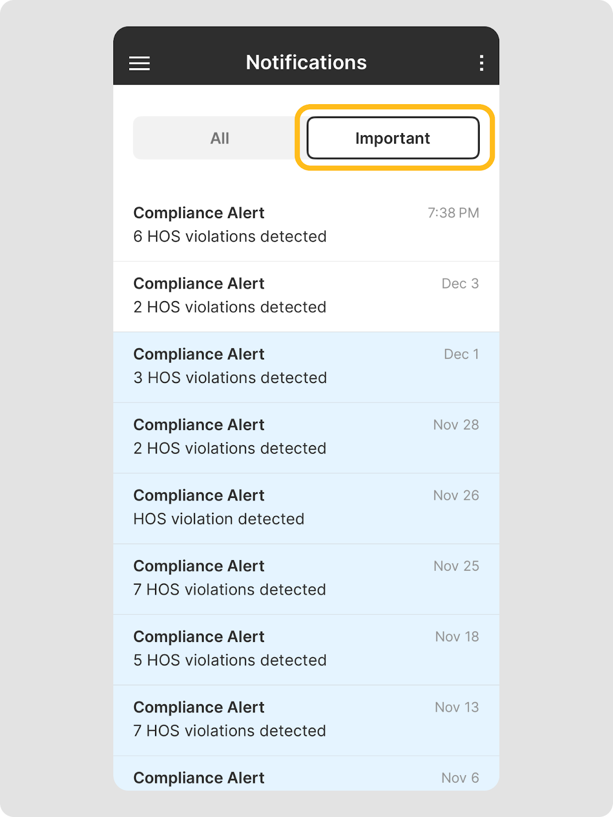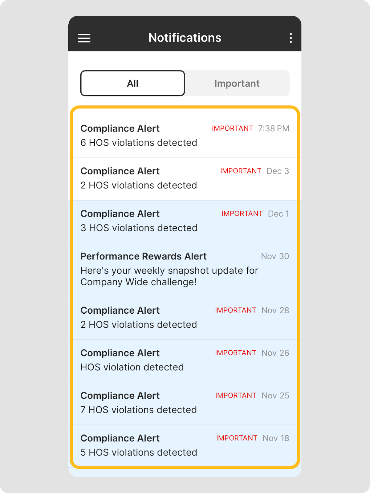 L’application Motive Driver comprend des outils de notification flexibles conçus pour tenir les chauffeurs informés des mises à jour critiques sans les distraire de la route. Les principales fonctionnalités incluent :