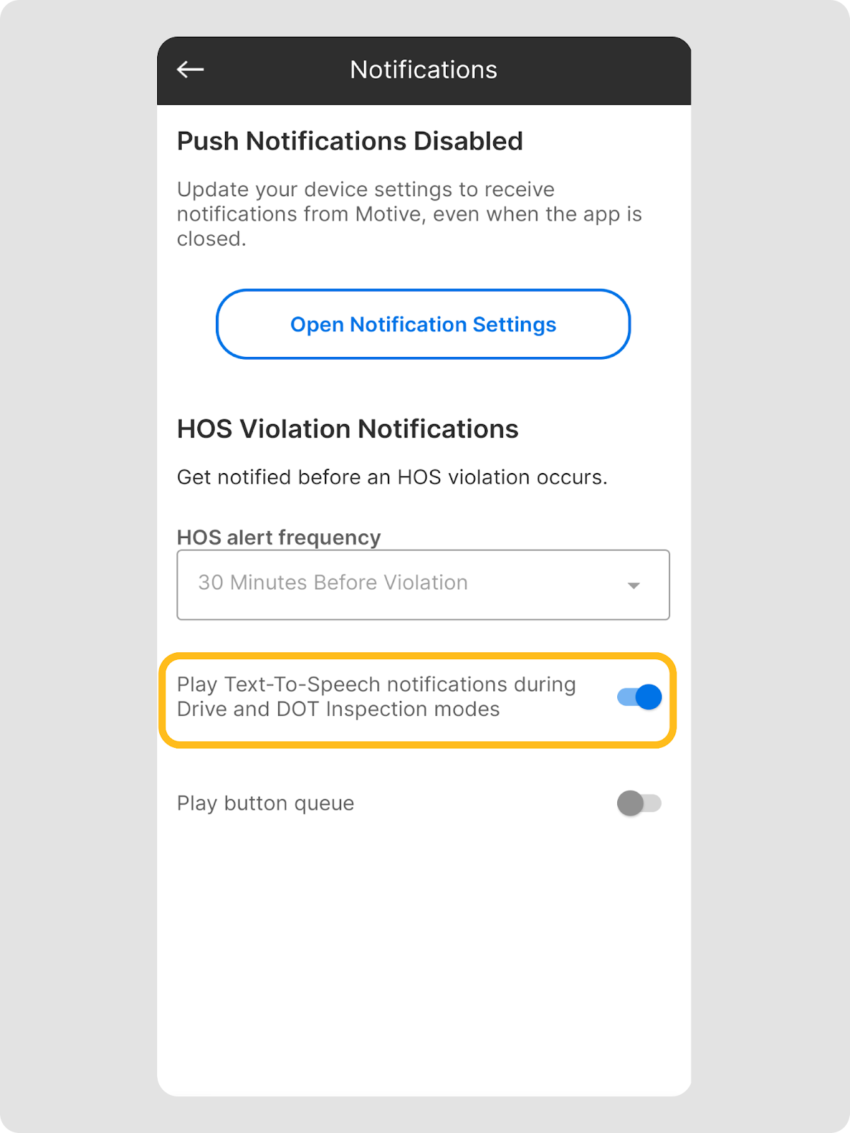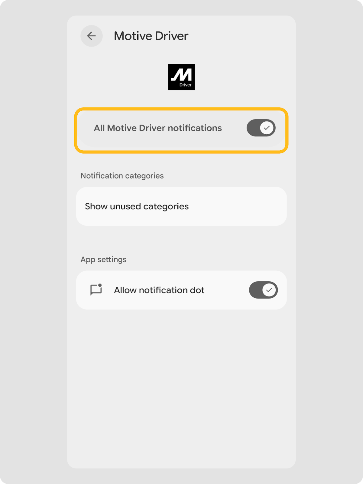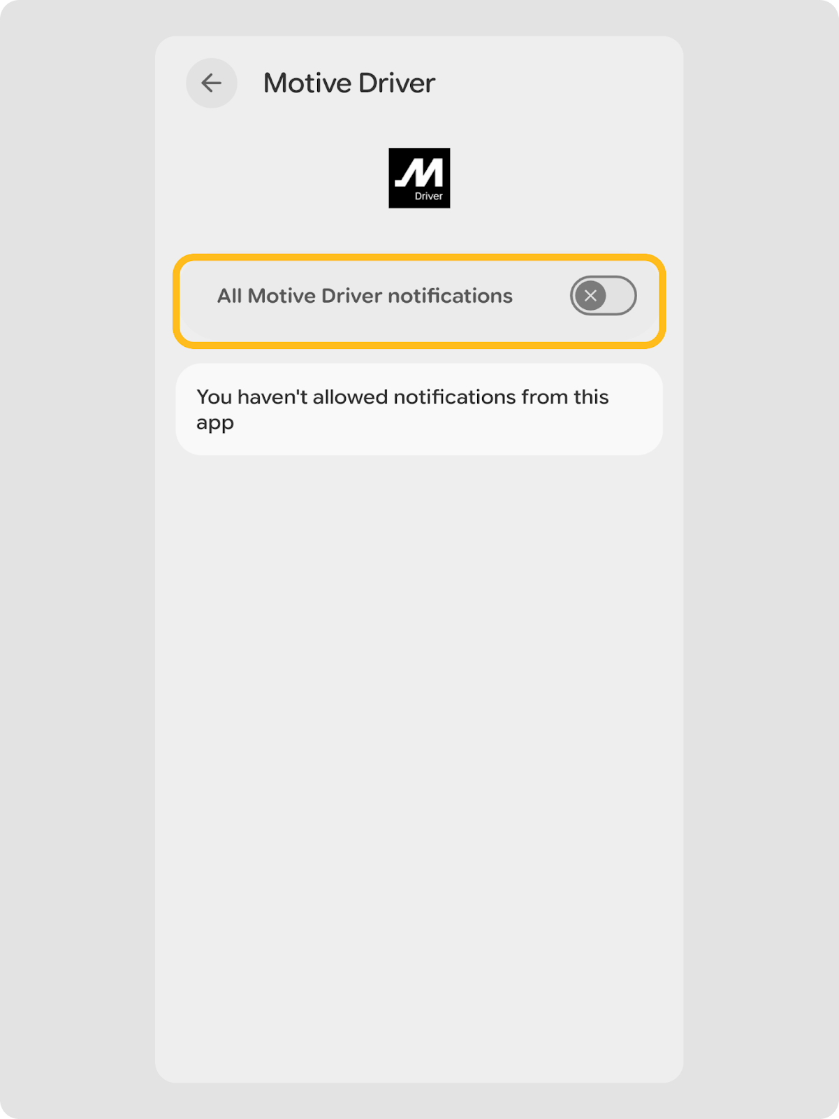 - Appuyez sur le bouton pour activer les notifications pour l’application Motive Driver.