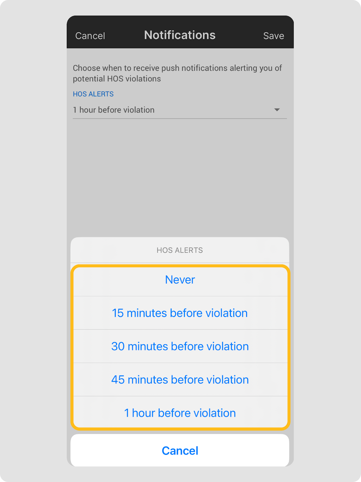 - Sélectionnez votre fréquence d’alerte de violation HOS.