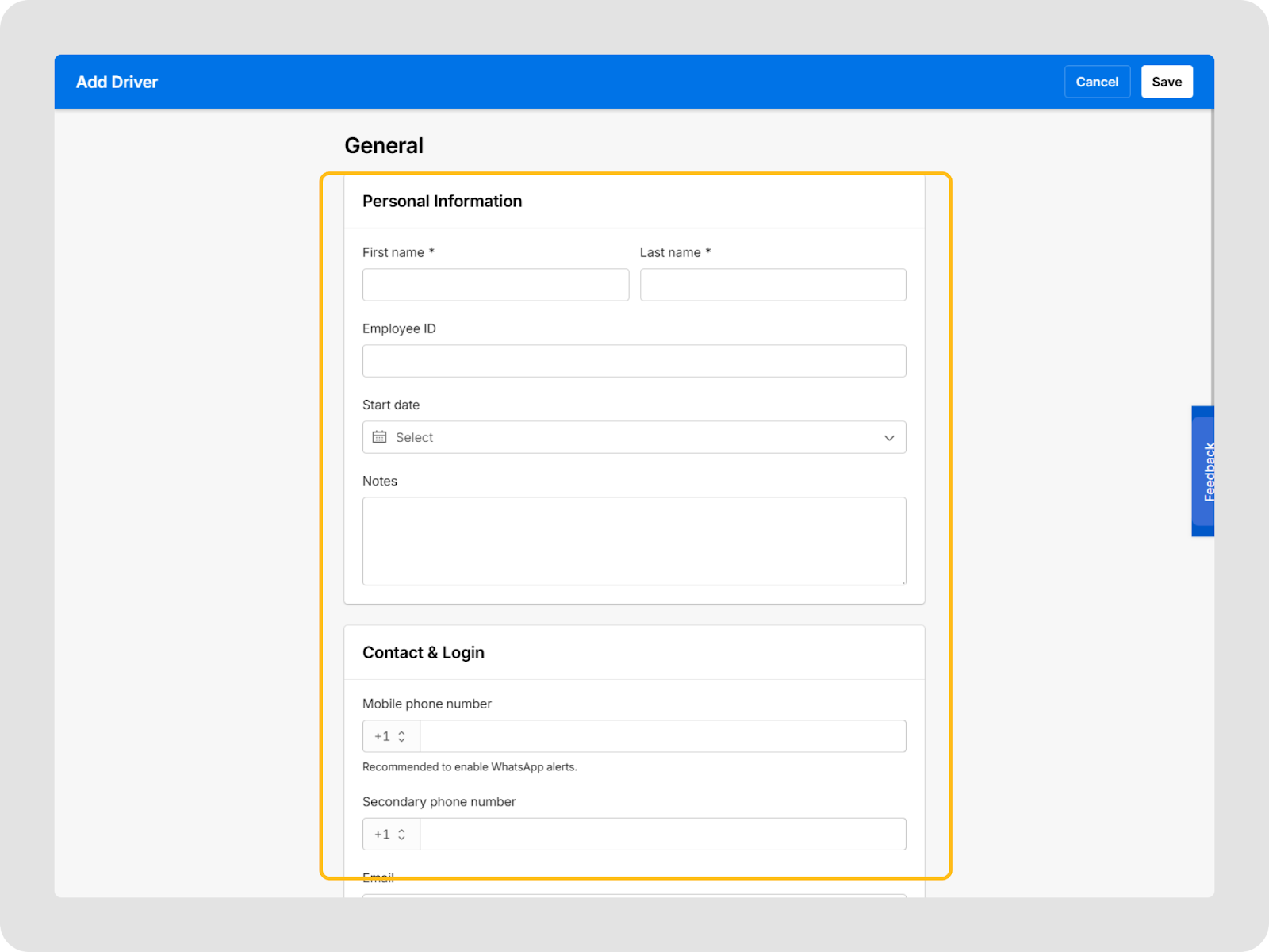 Dans la section Général, saisissez les informations personnelles du conducteur. Ensuite, ajoutez les détails de Contact et Connexion.